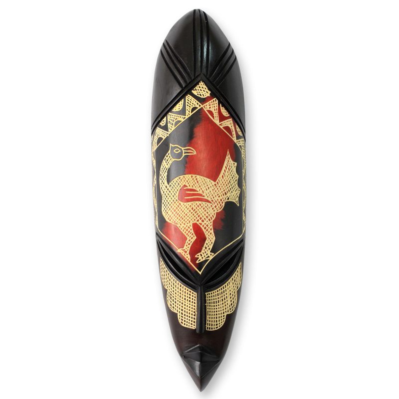 Ghana's Awudu Saaed creates the original design of this large sese wood mask to showcase the Sankofa Adinkra symbol. Represented by a bird looking backwards, Sankofa encourages to retrieve from the past what one needs to go forward in life. In black and red, the mask is expertly carved by hand by Saaed.