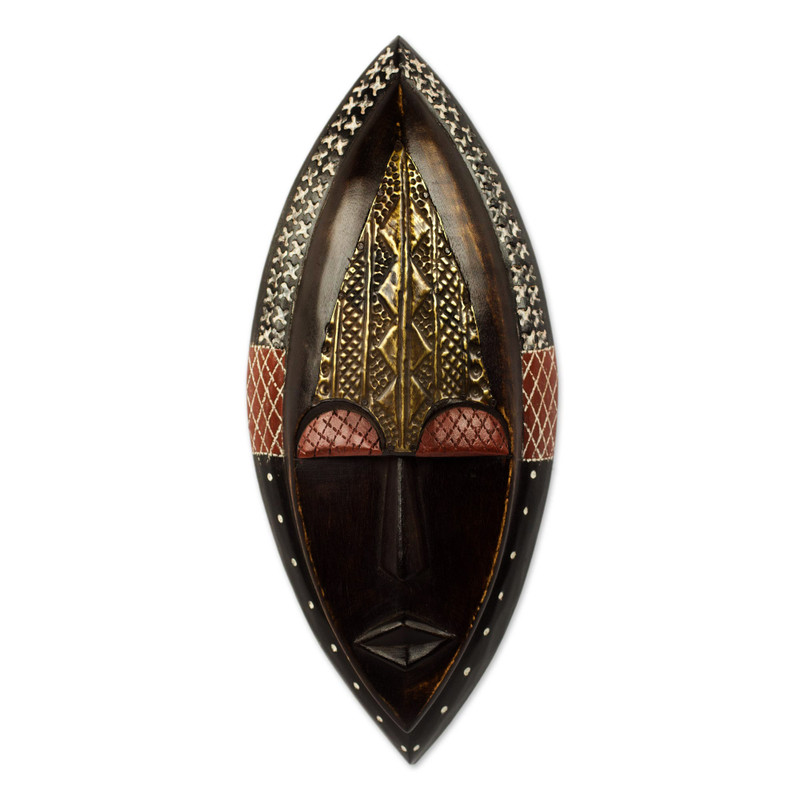 Quiet features exude tranquility and good will in this elegant African mask. Adorned with richly embossed brass, the design arises from artisan Rita Addo Zakour's own imagination. She names the exquisite piece Nutifafa, which means "peace be unto you" in the Ewe language.