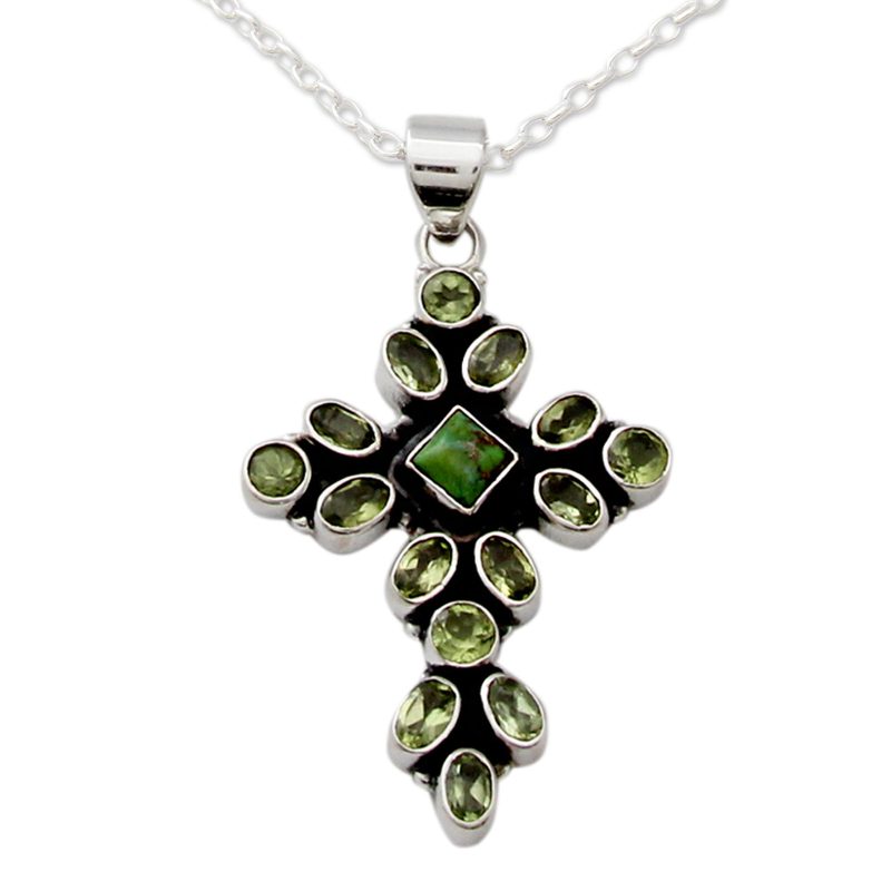 Four impressive carats of translucent green peridot shine alongside a center stone of green reconstituted turquoise in this cross pendant from India. Neeru Goel of presents this radiant pendant exuding Christian spirituality on a sterling silver cable chain.