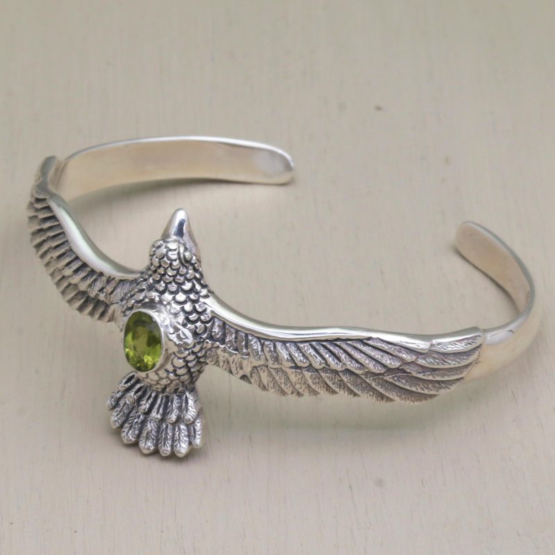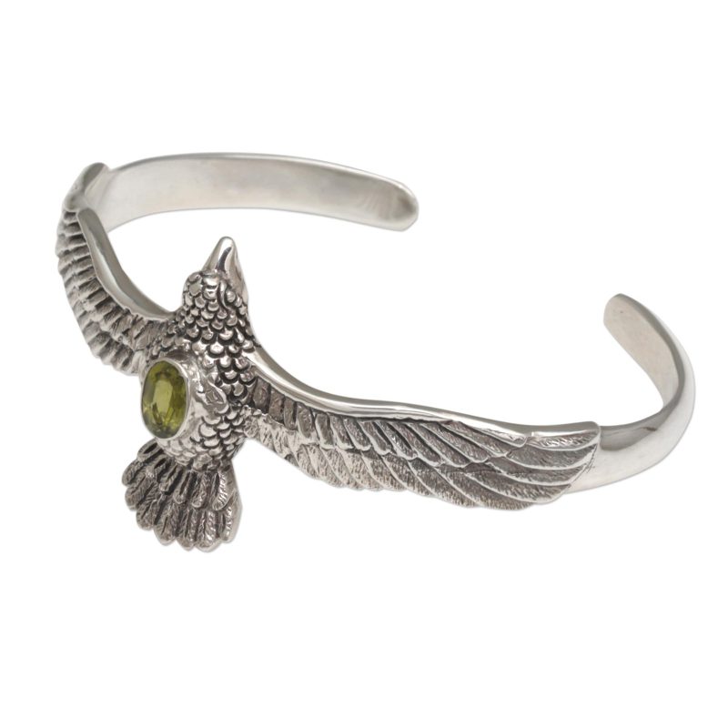 A brilliantly detailed hawk crowns a cuff bracelet from Bali's Nyoman Rena. The cuff is crafted by hand from sterling silver, with details emphasized by oxidation. A faceted apple-green peridot centers the design.