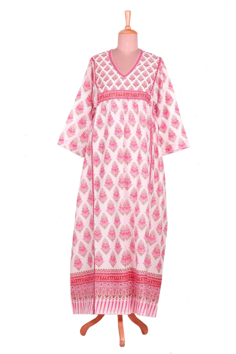 A pretty mix of bohemian block prints in carnation pink, melon and pistachio cover this empire waist maxi dress. The long, flowy 100% cotton dress features three-quarter length sleeves, a v-neckline, and ties at the side to adjust the fit. Feels like loungewear, but looks pretty enough for a garden party!