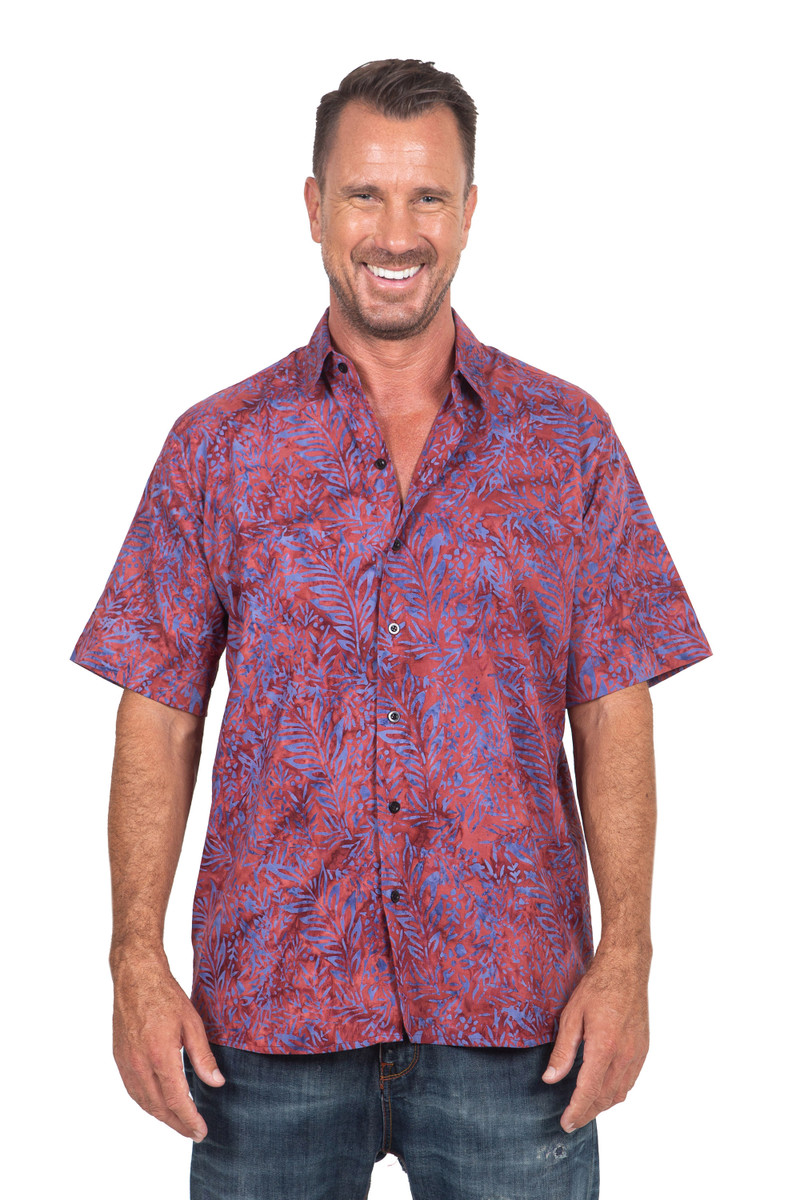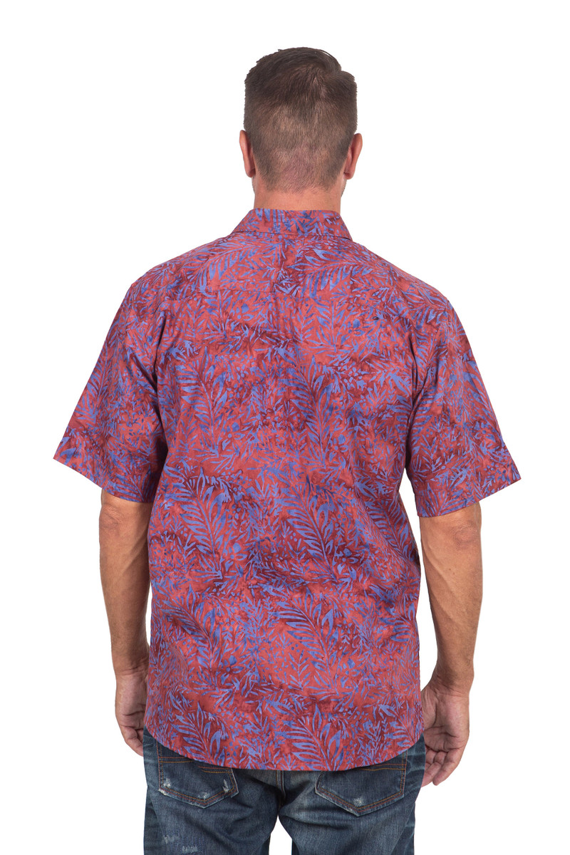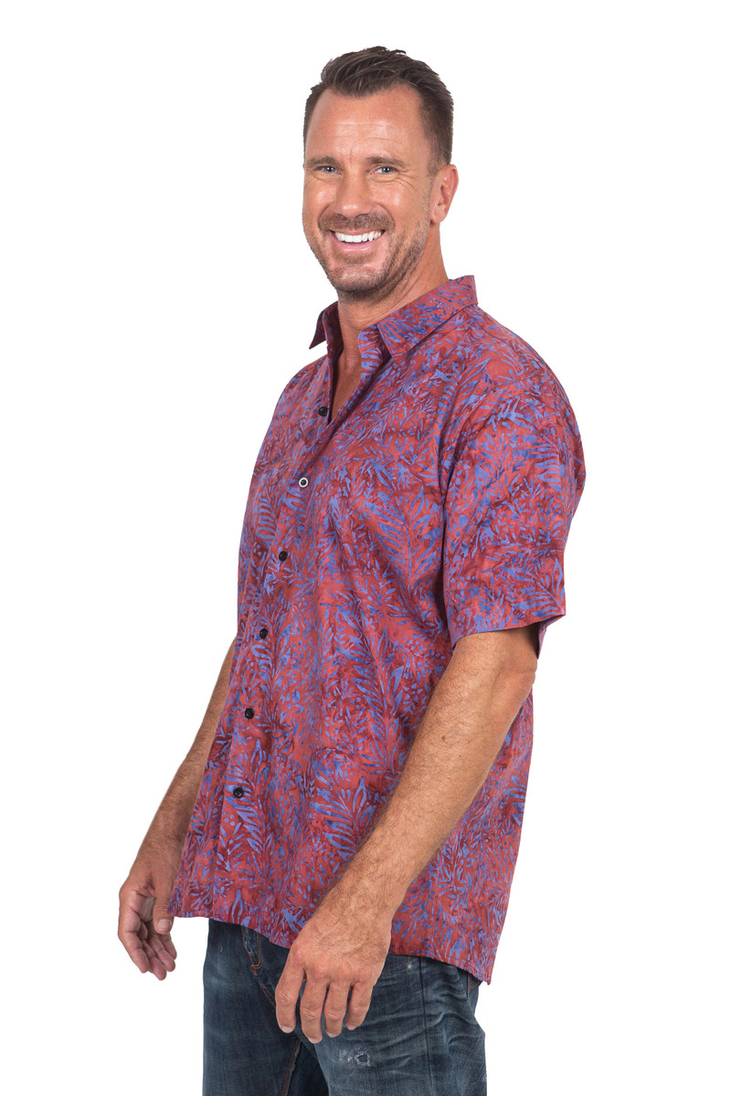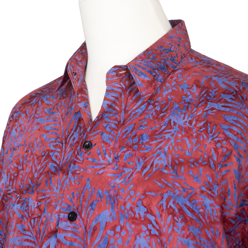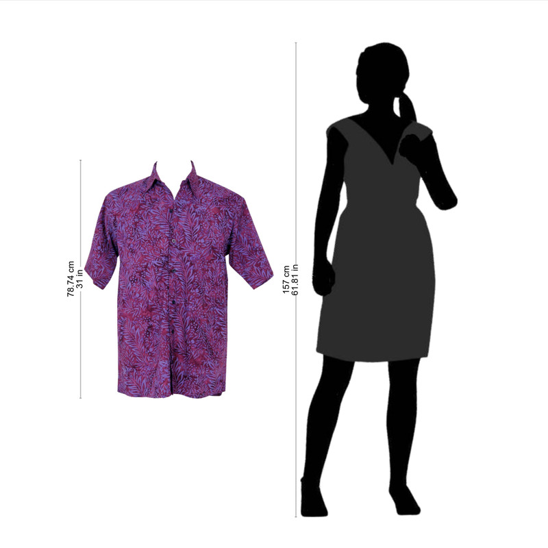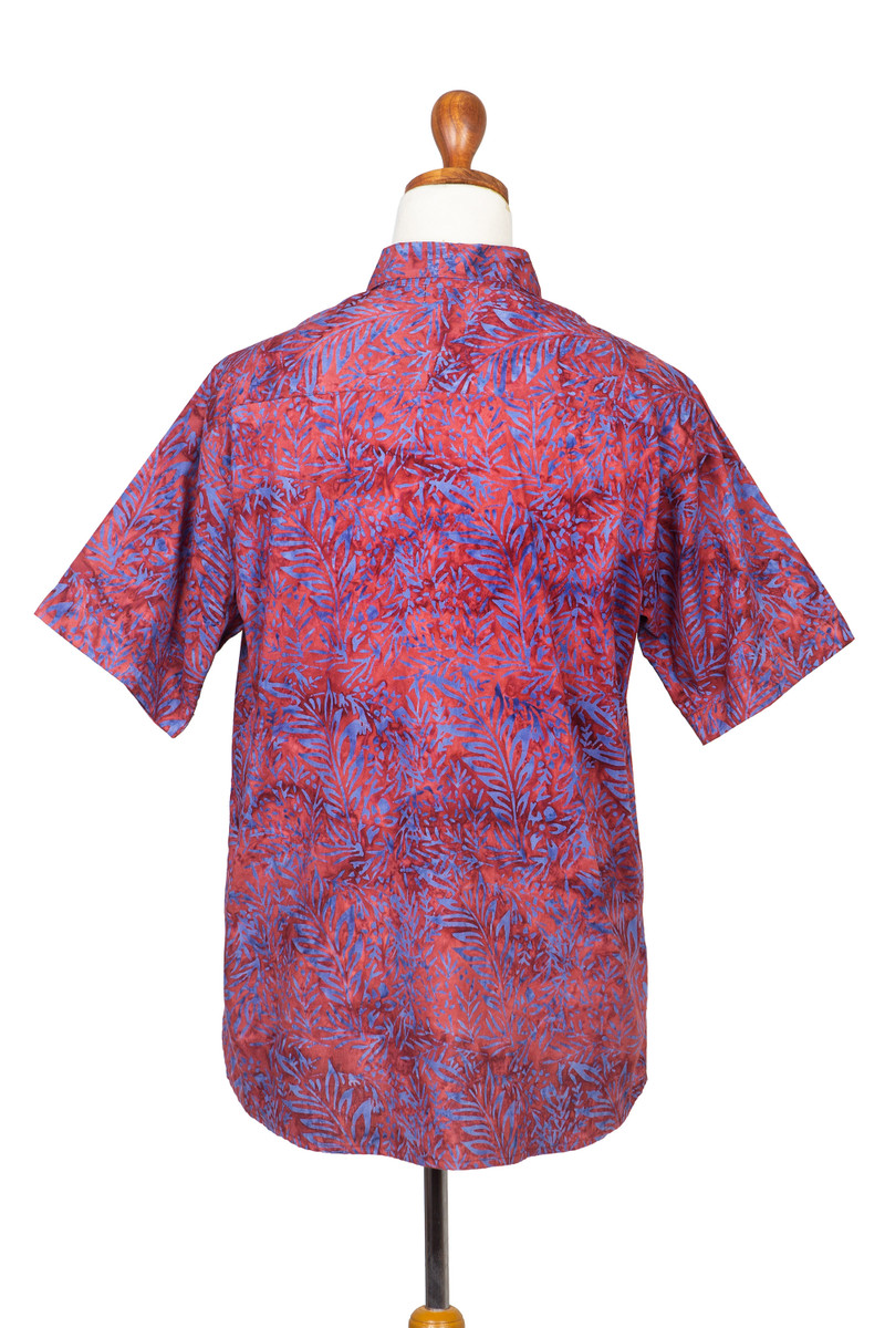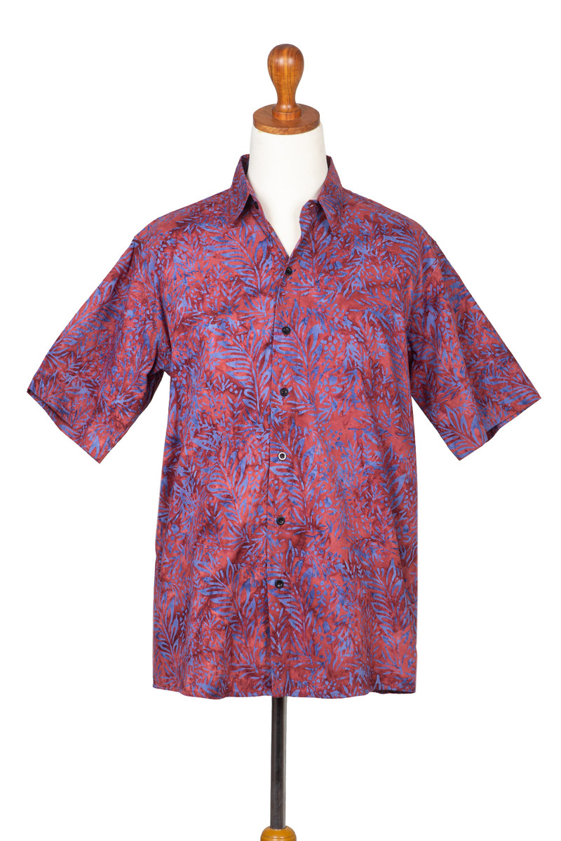 This handsome men's cotton shirt is the creation of Saktut Raitawati in Bali. She employs time-honored batik techniques to create a pattern reminiscent of a tropical jungle choked with vegetation in shades of light purple on magenta. The short-sleeved shirt features classic button-down styling, a straight hem and a spread collar.
