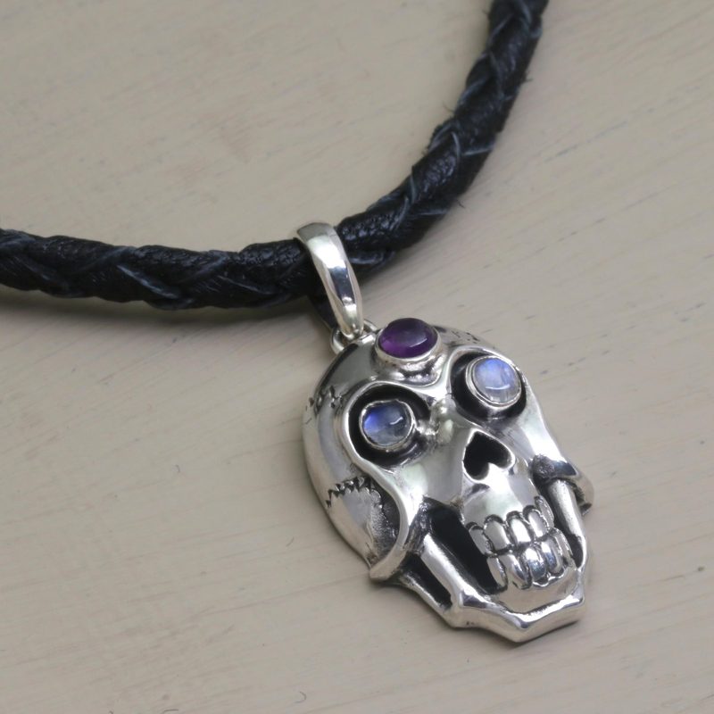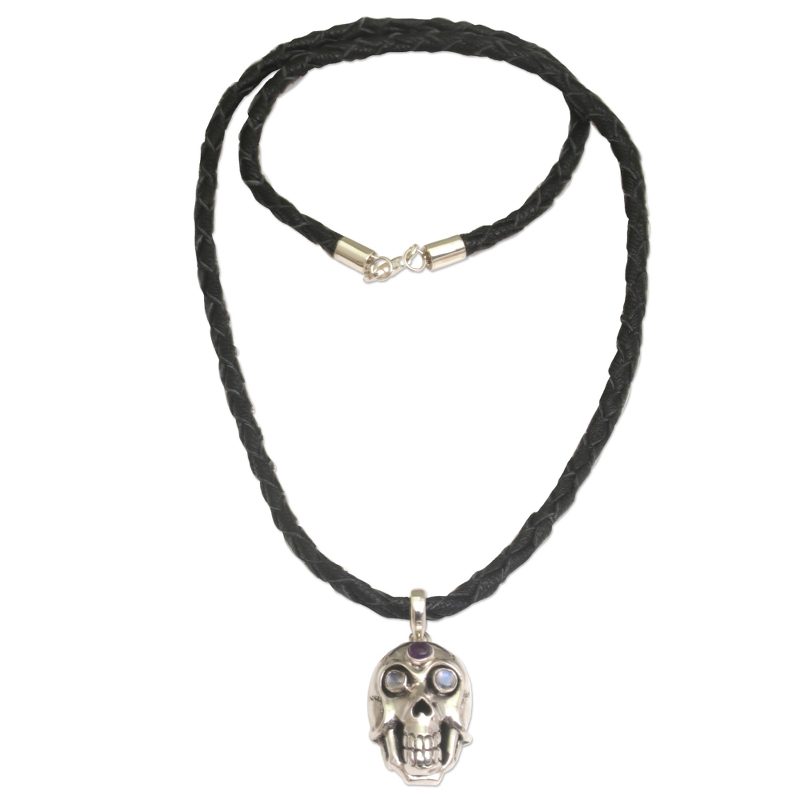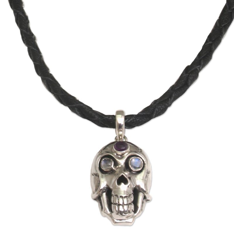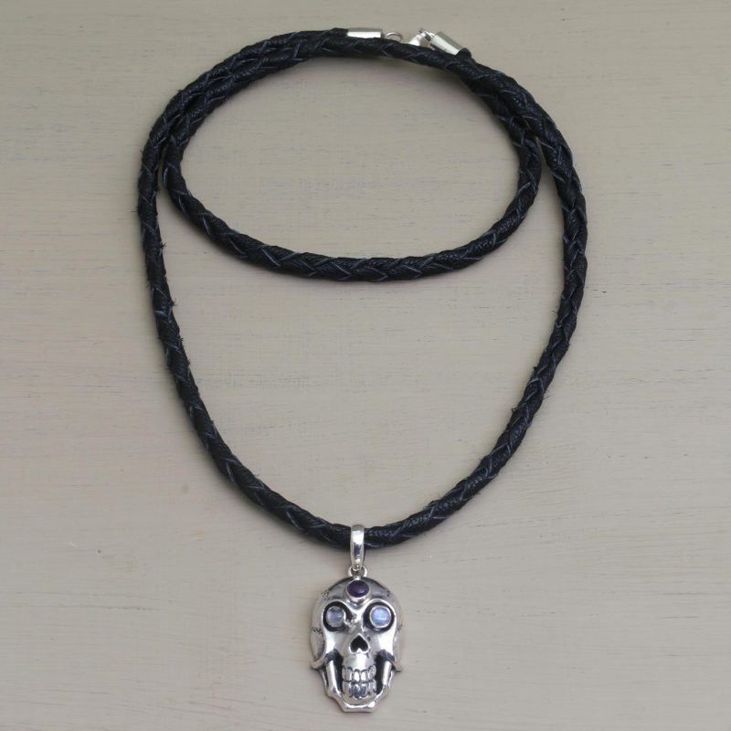 By Indonesia's Nyoman Rena, this pendant necklace adds a deadly charm to any wardrobe. A skull is crafted of gleaming sterling silver with two eyes of rainbow moonstone and one eye of purple amethyst. The pendant centers hand-braided leather cord for a striking accessory.