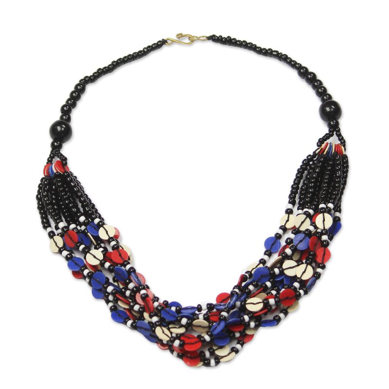 Eight scintillating strands of red, white and blue beads combine with black for a dramatic necklace. Ila Suleyman selects seed beads of recycled glass and disks of recycled plastic to make a statement for ecology. He names his design Mpusia, which means "Thank You" in the language of Northern Ghana.