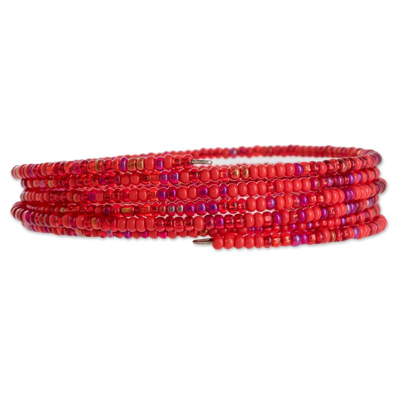 Evoking passion, this wrap bracelet is created by Guatemalan artisan Mirian Zet. She selects petite beads of red glass that circle the wrist several times.