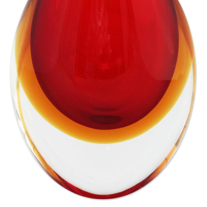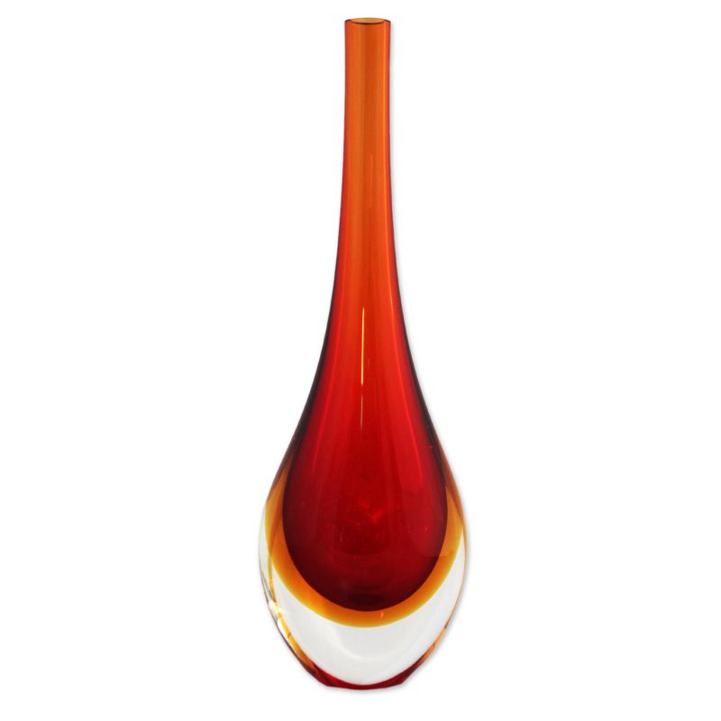 Like a tall flame captured in a sea of glass, this Murano-inspired art glass decorative vase presented by the Seguso Family of Brazil makes dramatic transitions from a bold red-orange to amber to clear. The Seguso Family has been recognized for the creativity and originality of their work, with an increasing number of admirers and collectors from the world of art glass enthusiasts.
