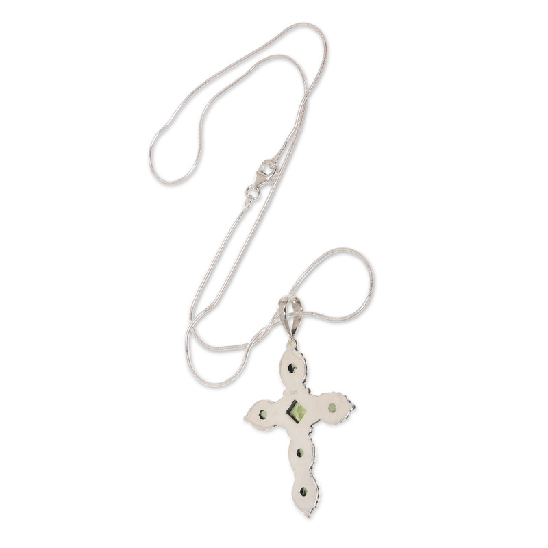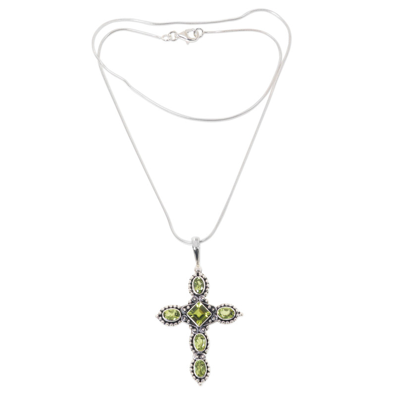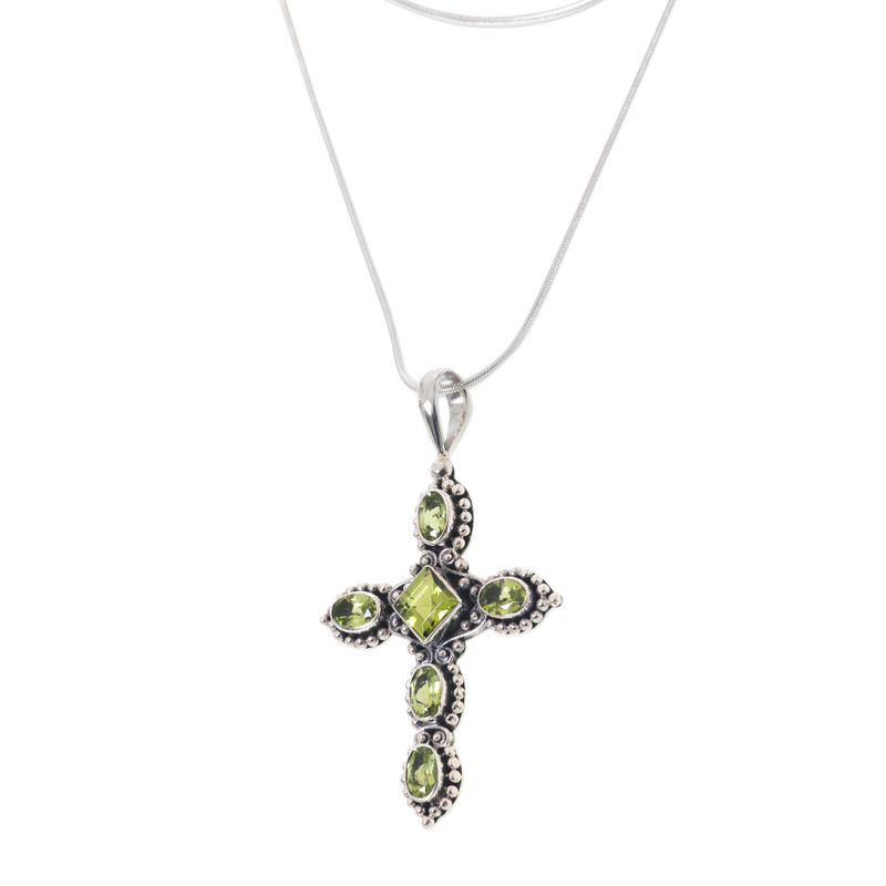 Modern Indonesian design gives rise to this elegant cross and chain. Radiating peridot's green promise, the necklace comes from Nyoman Rena. Peridot represents August´s birthstone.