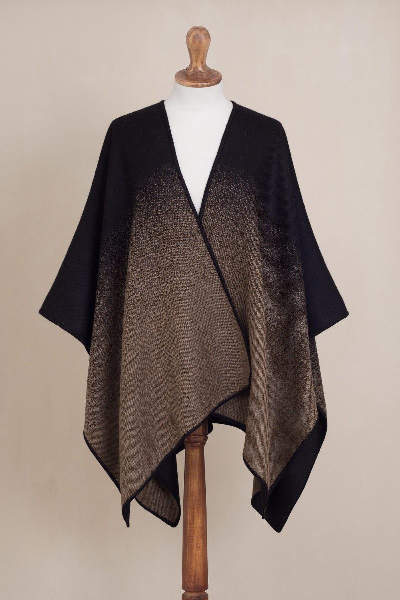 Evoking the Andean wind, this ruana from Peru combines tan and black with a stippled ombre pattern for a luscious addition to your wardrobe. Isidoro C'cahuantico designs the soft alpaca blend ruana, giving it a reversible design to suit your mood.