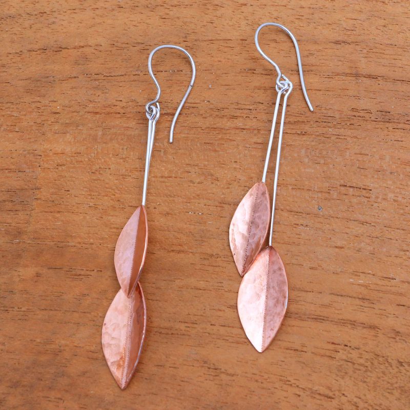 Descending from bars of sterling silver, four leaves are handcrafted from copper bathed in 18k rose gold. Bali's Nyoman Nartawan designs this feminine pair of dangle earrings.