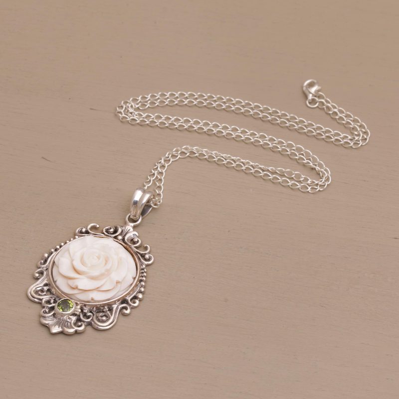 The natural beauty of a perfect rose is captured for eternity in a pendant of smooth, carved bone. The rose is hand-carved by artisan Made Wardika, and centers a pendant of sterling silver replete with romantic flourishes. A faceted apple-green peridot adds a dash of color to the design. The artisan centers the pendant on a classic sterling silver Cuban link chain.