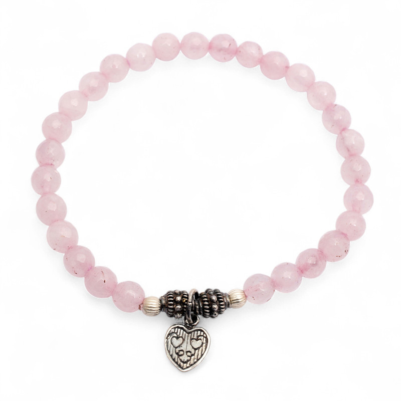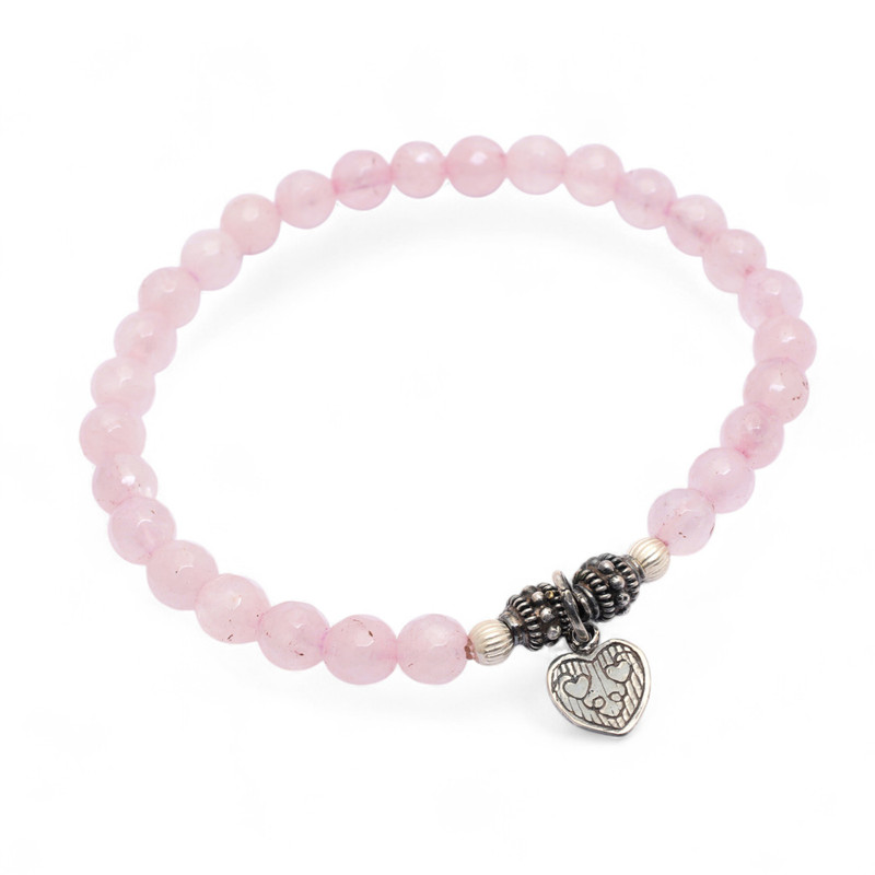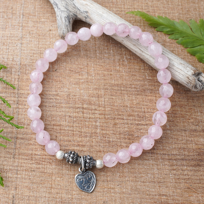 Balinese artisan Ketut Sulastri expresses her love with this elegant bracelet, featuring a beaded strand of natural rose quartz that circles the wrist. Working with local artisans, Sulastri accents the lovely bracelet with a striped heart charm of sterling silver, flanked by elaborate silver beads.