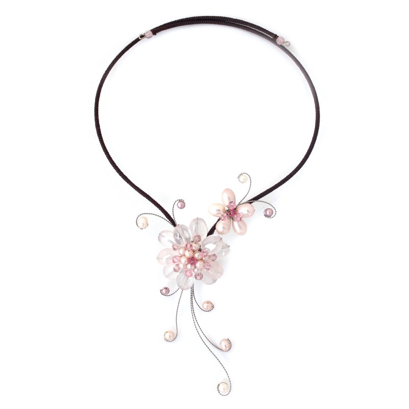 A star-burst of rose quartz petals forms an ethereal chrysanthemum centered with cultured pearls. It graces a choker accented with sparkling beads and quartz. Lavish and lovely, Busarin's handcrafted necklace celebrates Thailand's beautiful flowers.