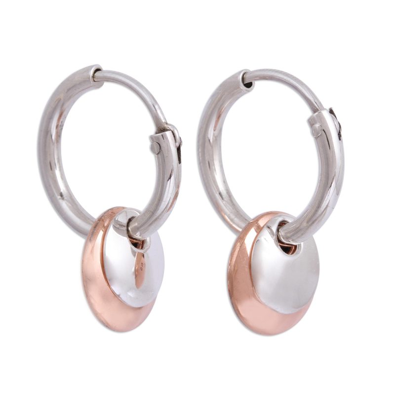Crafted of sterling silver, two moons eclipse copper suns an elegant pair of dangle earrings from Mexico. Guillermo Arregui works in the time-honored tradition of Taxco silversmithing to create this hoop-style accessory.