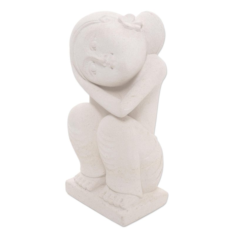 She tucks her knees close to her body and rests her head in her hands. Gazing into the distance, a young girl dreams of life, of love. This charming abstracted portrait is sculpted in sandstone by Wayan Kandiyasa.