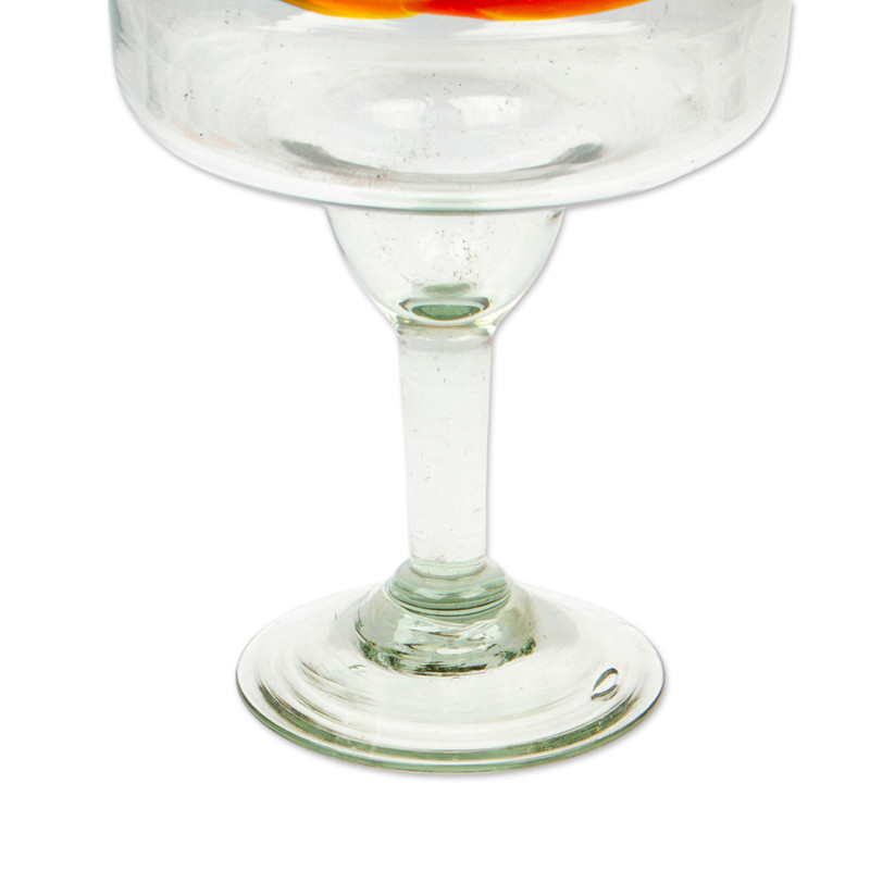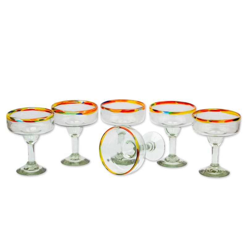 Poised on transparent stems, margarita glasses feature colorful rims in bright confetti colors. The set of six is part of the Novica Handblown Collection. Endlessly versatile, they do double duty at dessert time for sherbet, custard, or gelatin.