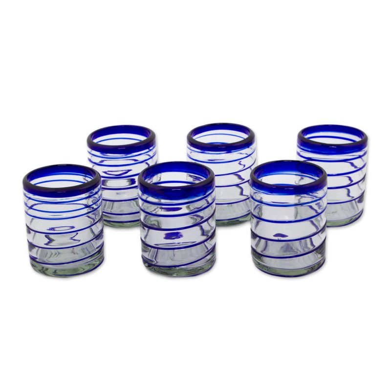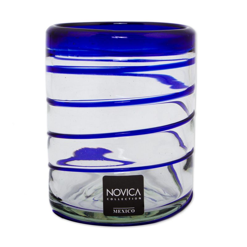 This set of six rocks glasses from Mexico are hand-blown from recycled glass for the Novica Handblown Collection. Featuring clear bodies with cobalt blue spirals and rims, they glasses make the perfect addition to any home.