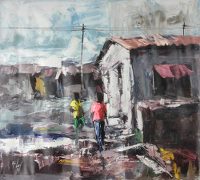 In tones of grey and brown, the small houses of a slum in Ghana are captured with care and emotion in this impressionist painting. Two people walk side-by-side through the huts. Artist Hilton Korley Boye describes his effort as "Trying to express how there are slums in most of our communities but it is beautiful when captured on camera or with colors on a canvas."