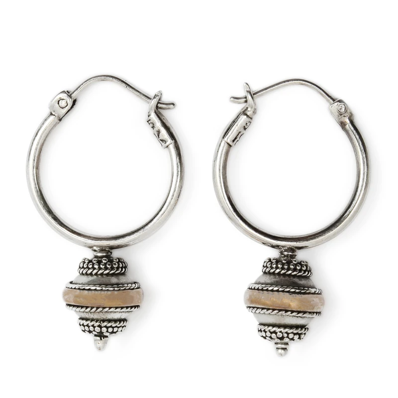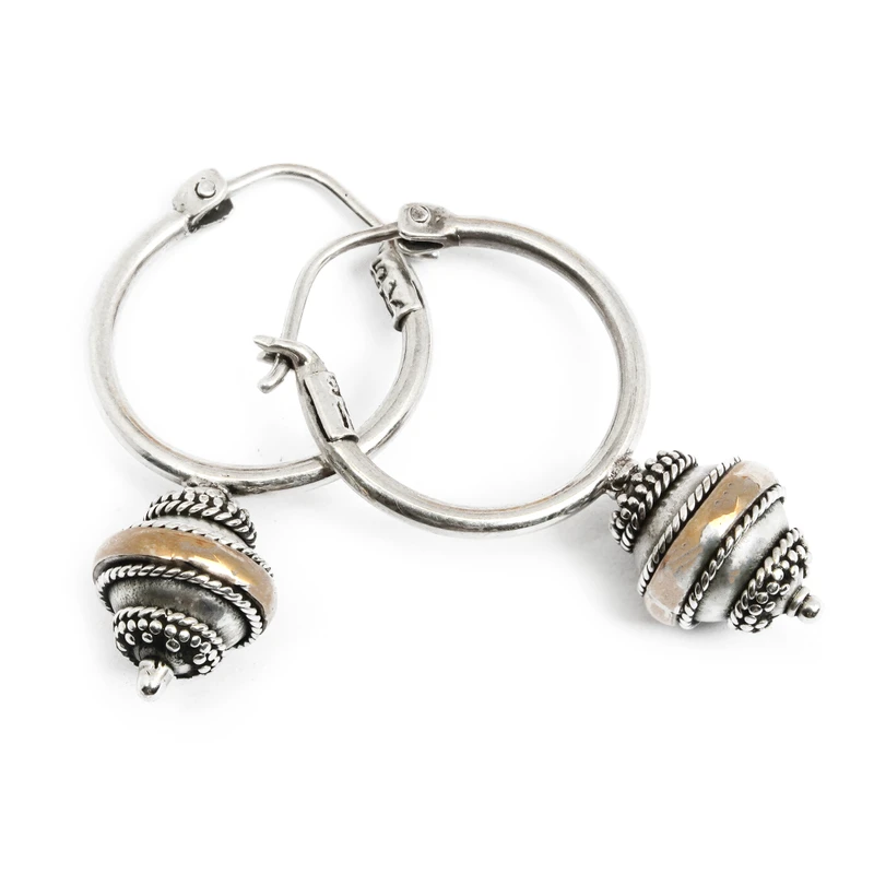 Diah Arini celebrates tradition by designing earrings reminiscent of ancient Balinese offering jugs. Handcrafted of sterling silver, the hoop earrings are detailed with 18k gold plated accents and oxidized contrasts.