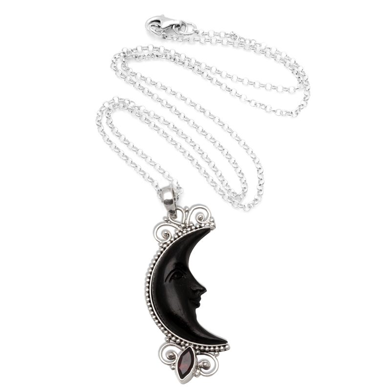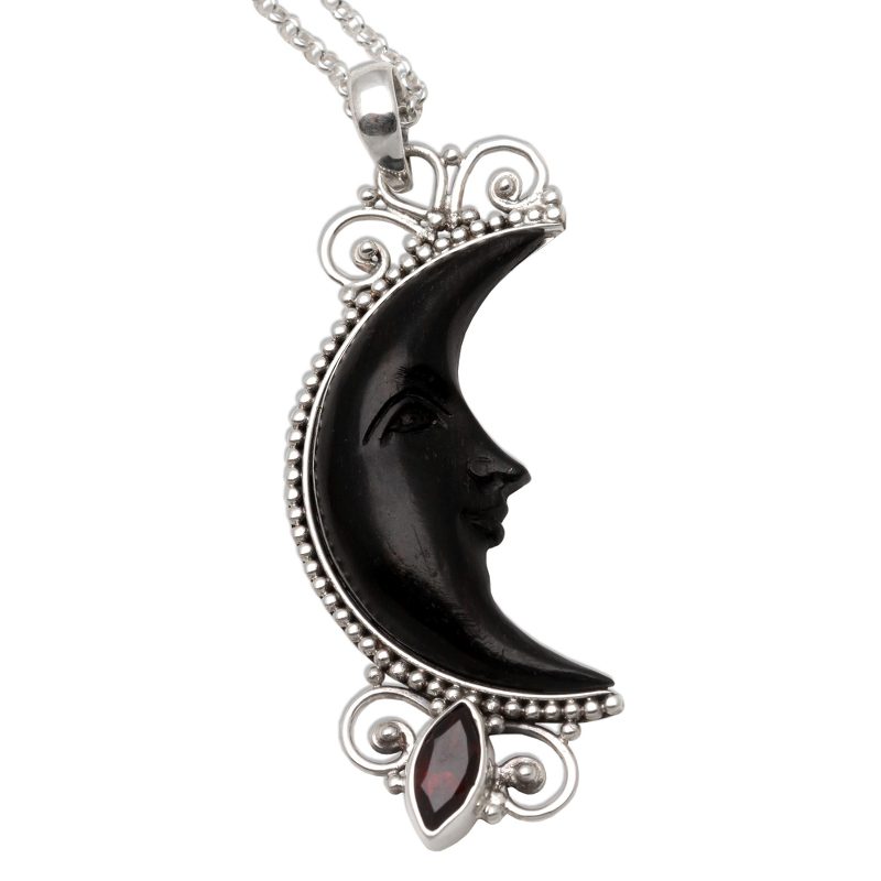 Meticulously carved by hand, the crescent moon nestles amid sterling tendrils and silver granules known as jawan. Made Wardika creates a universal image in buffalo horn for this mesmerizing necklace. A faceted marquise garnet augurs the approaching dawn.