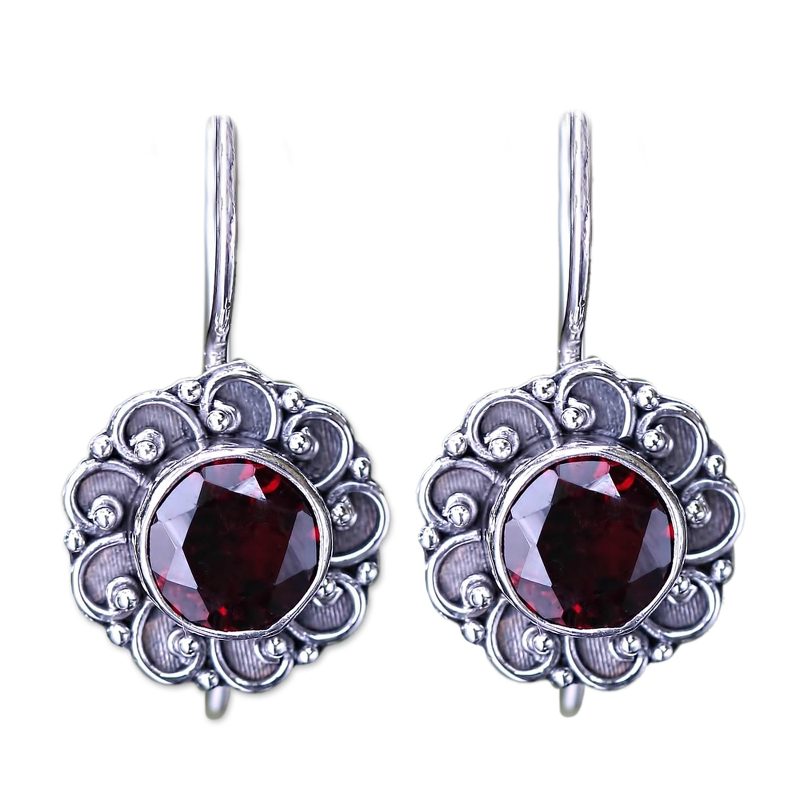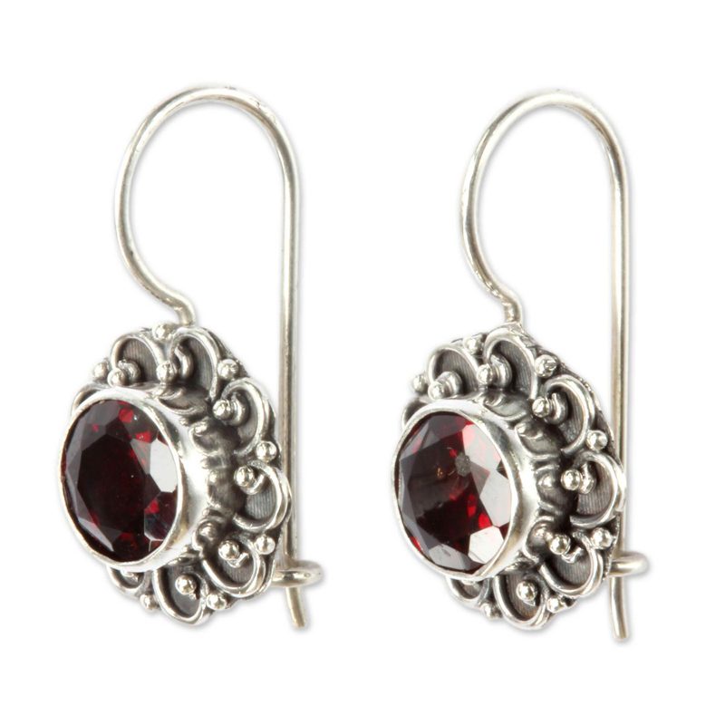 Cheerful sunflowers with centers of red garnet grace these pretty earrings from Balinese artisan Sukartini. The drop earrings feature contrasting silver finishes and 3 carats of gemstones.