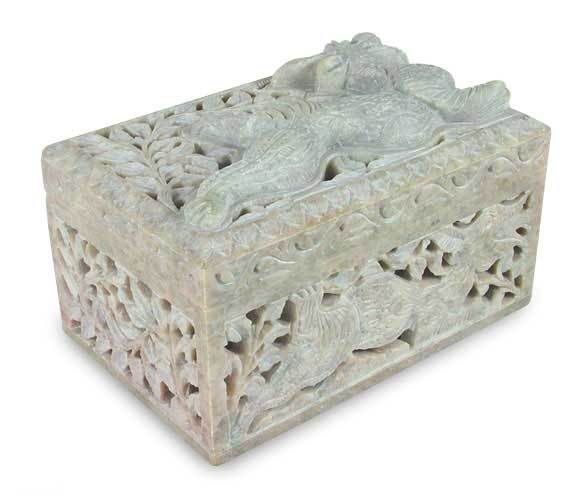 Gulam Rasool depicts dragons prowling in a fertile forest on a dramatic soapstone jewelry box. A master at traditional jali or openwork carving, he works in natural soapstone.