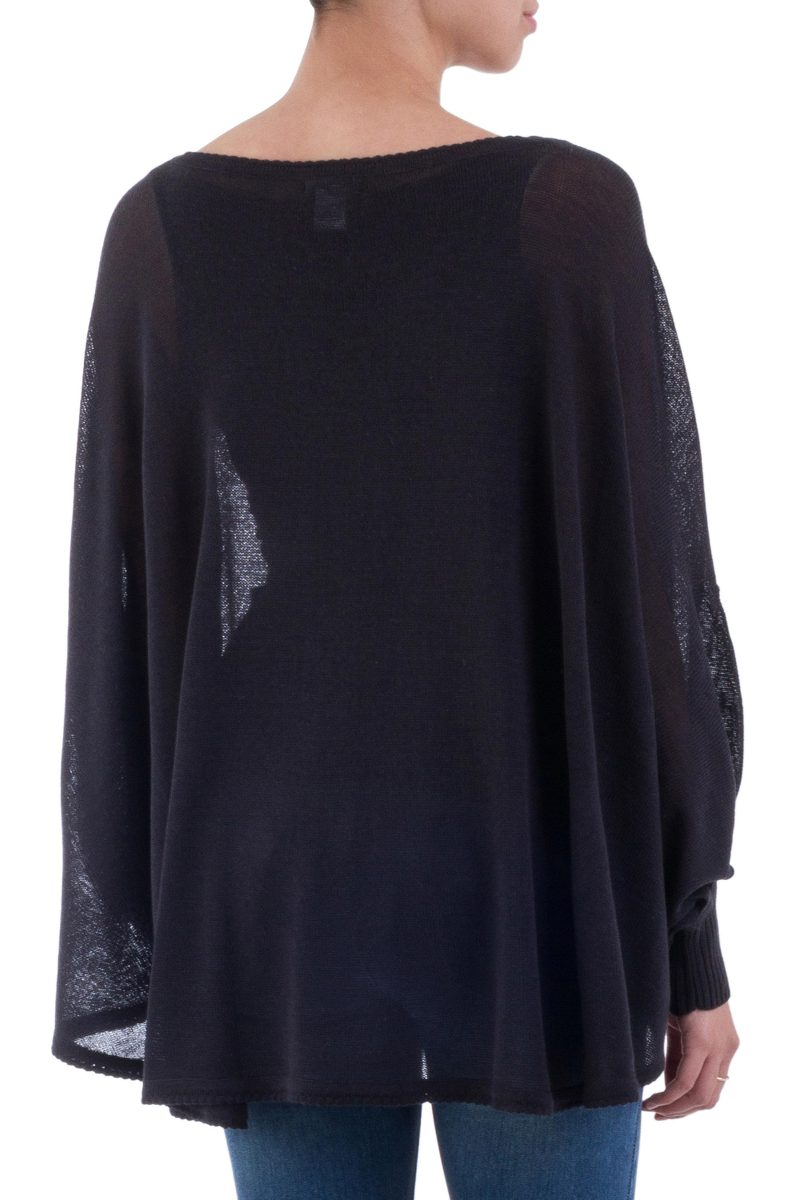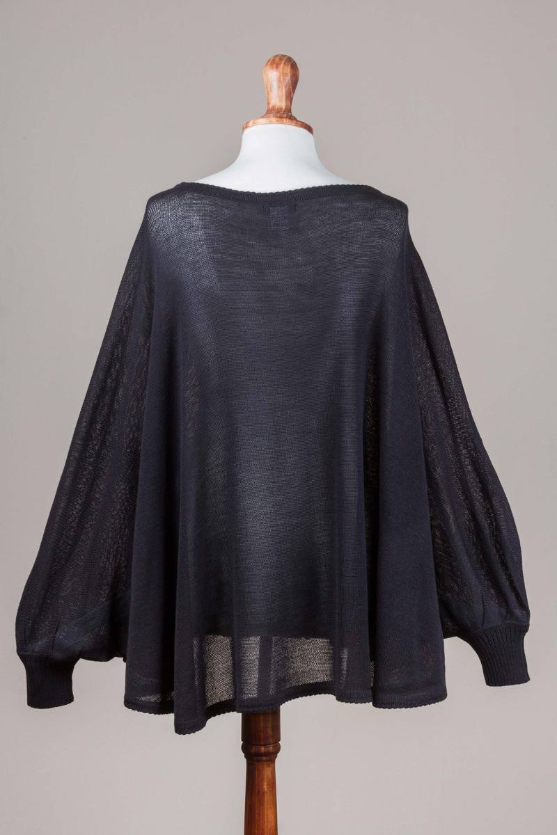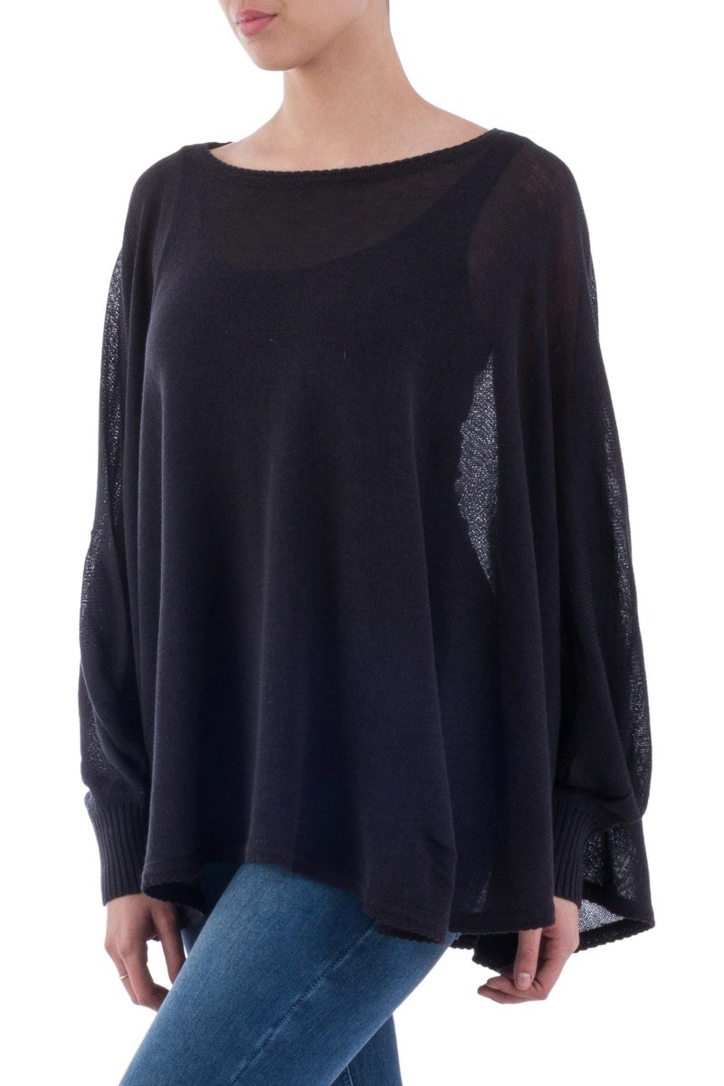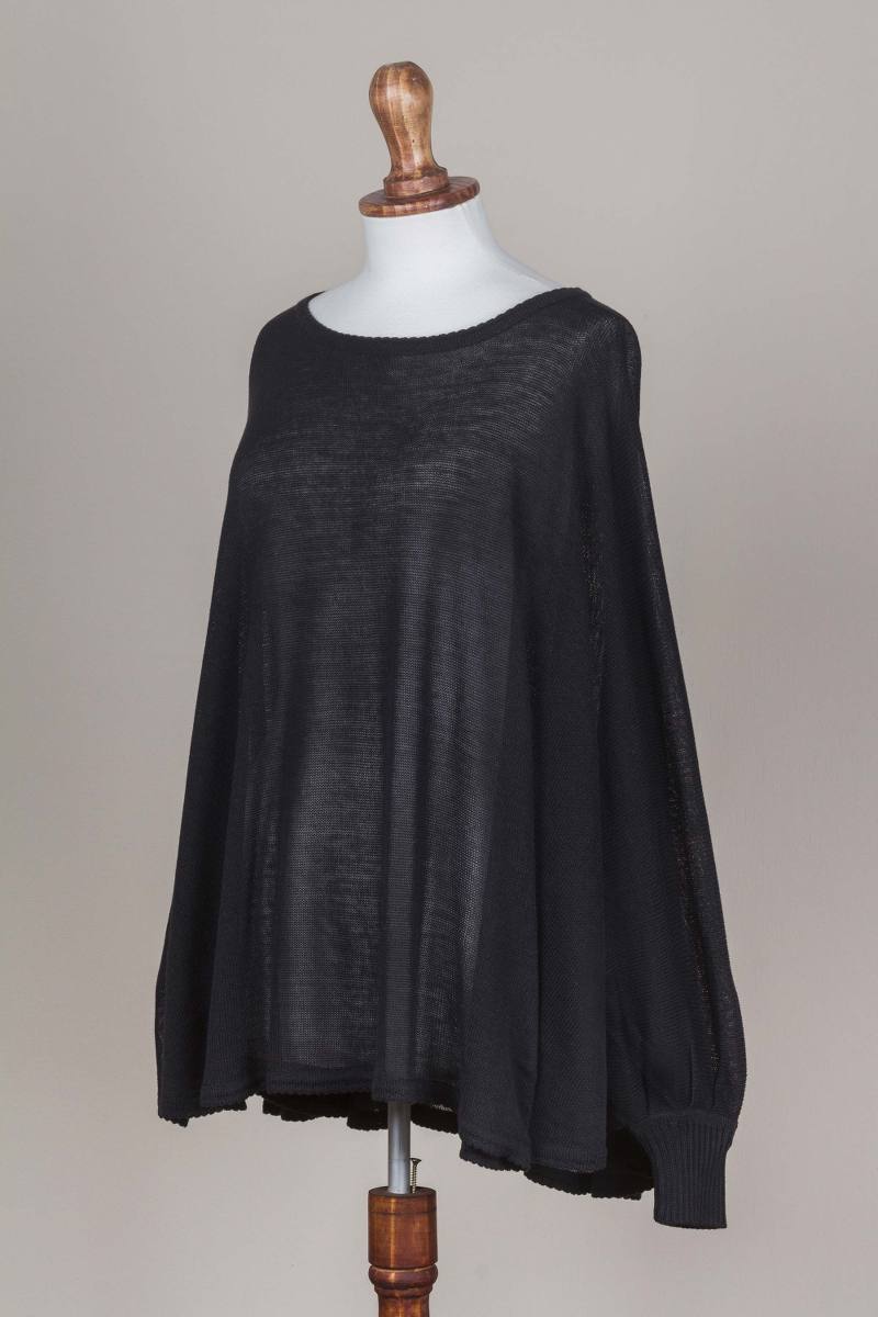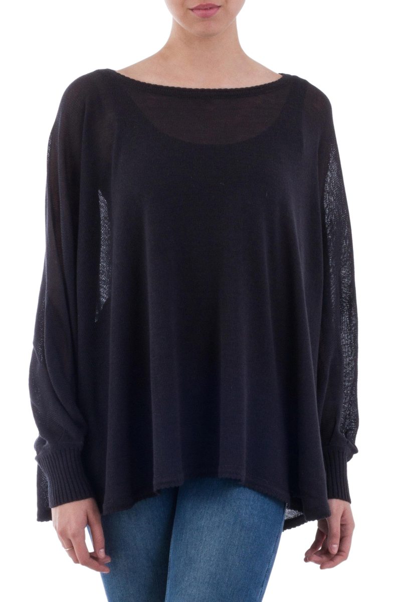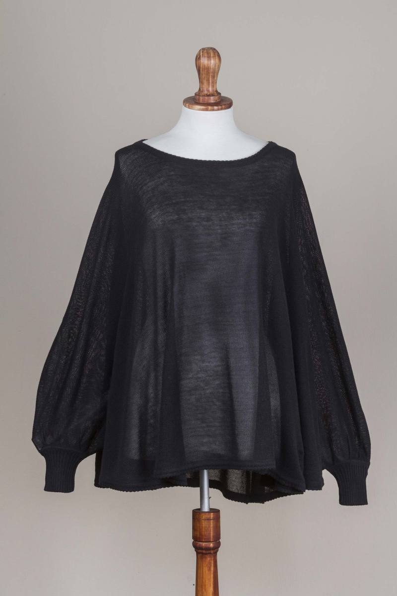 From Peruvian artisan Alfredo Falcon comes this solid knit sweater in black. The design features a boat neck, elegantly draping style and batwing sleeves finished with a ribbed cuff. Pair this flowing sweater with jeans or leggings for a look that will get you through winter weather in style.