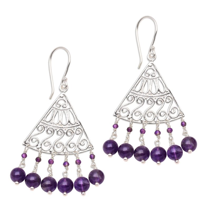 Gleaming purple, a chandelier of amethyst beads dangles from these Balinese earrings. Ketut Sulastri works with sterling silver, crafting each earring in a triangular fan shape to display spirals and intricate openwork.
