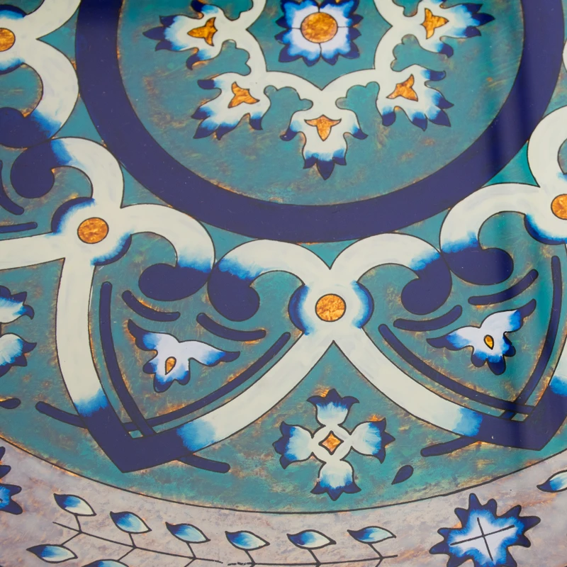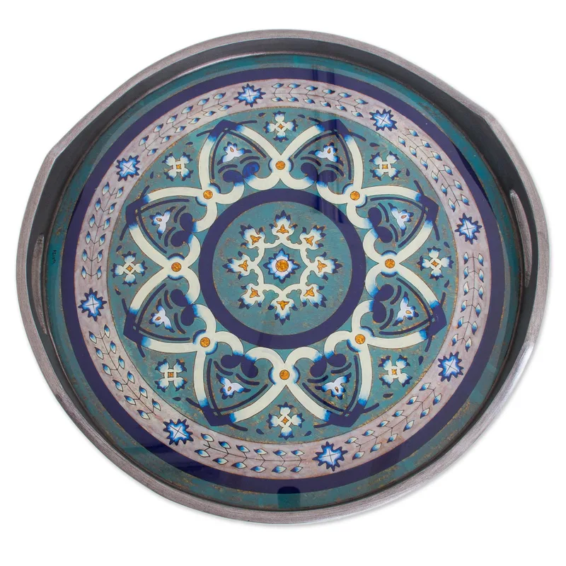 Hand-painted with intricate floral motifs, this traditional reverse-painted glass tray is designed by Peru's Asunta Pelaez. She hand-pants the designs onto the reverse side of a glass panel, decorating the tray's bottom. The tray is crafted of wood, complete with steel-tone trim and handles at the sides.