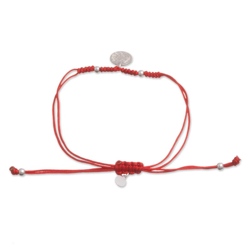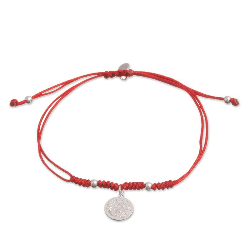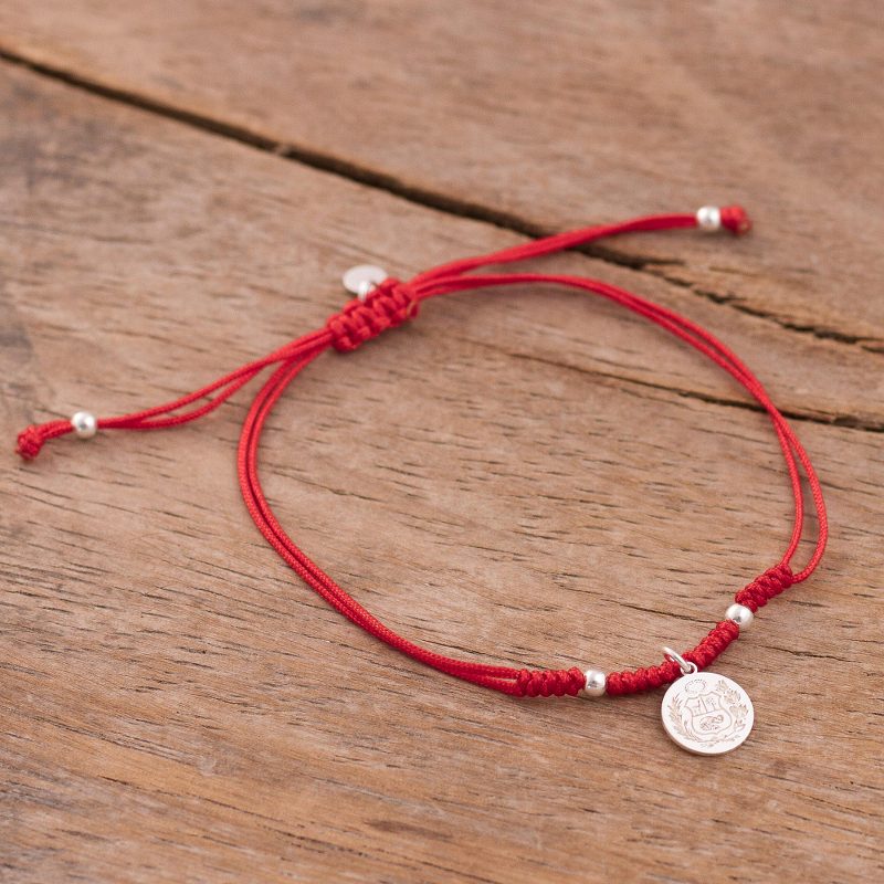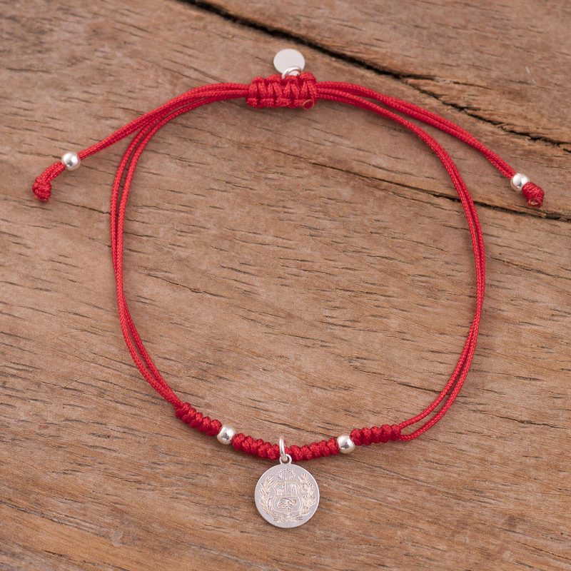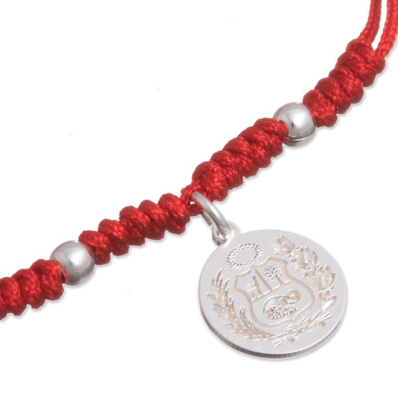 Circling the wrist with red nylon cord, this bracelet carries the pride of Peru wherever it goes. Marianela Vargas creates this accessory, centered by a dangling sterling silver charm that depicts the National Coat of arms, or National Shield, of Peru. An adjustable sliding knot completes this bracelet, accentuated by a sterling charm with the artisan's initials.