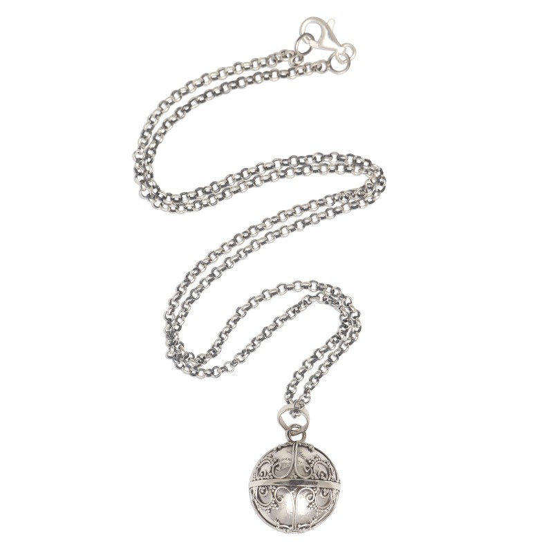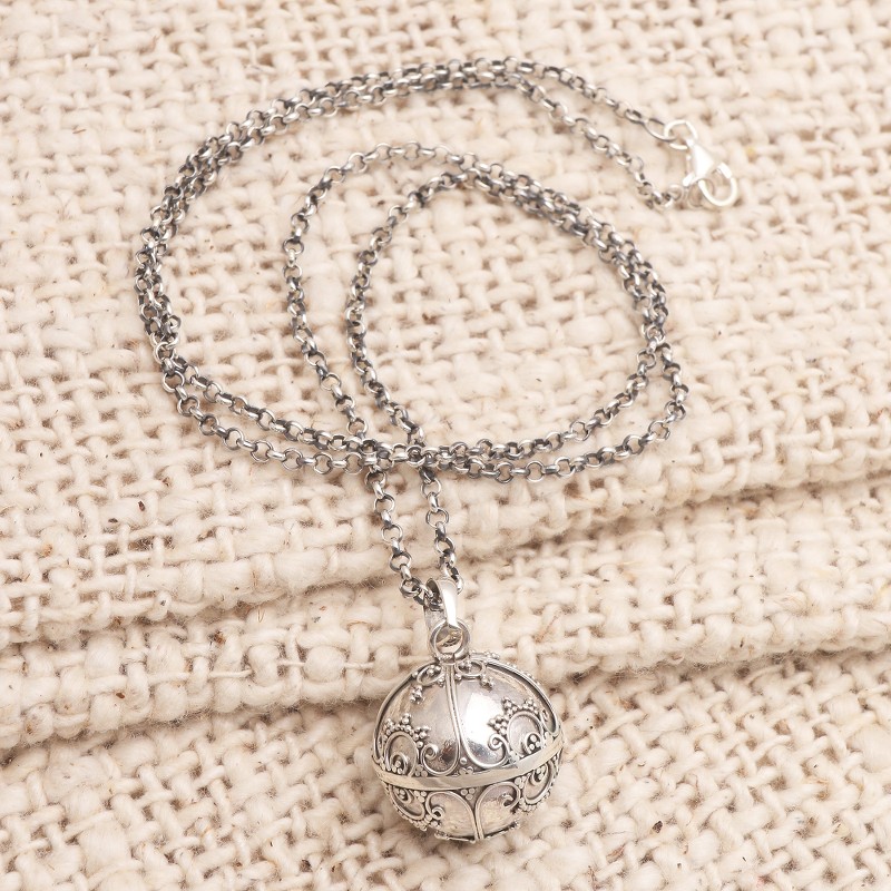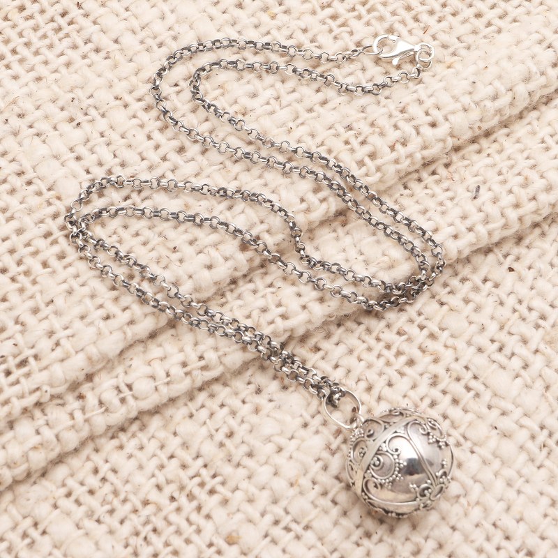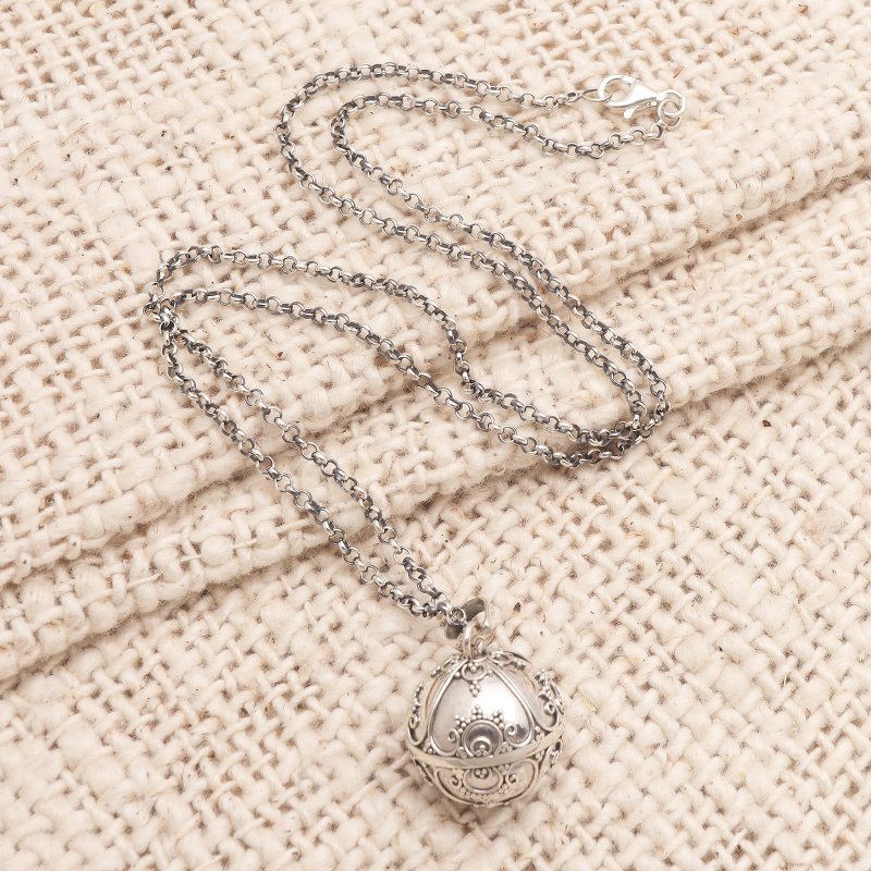 Also called "angel necklaces" and "harmony balls," Such necklaces are often worn by pregnant women in Bali and also in Mexico. The chain lets the pendant reach to the belly and the delicate sounds are thought to soothe the mother and the baby she is carrying. Some believe it summons a guardian angel, thus making it a symbol of loving protection.