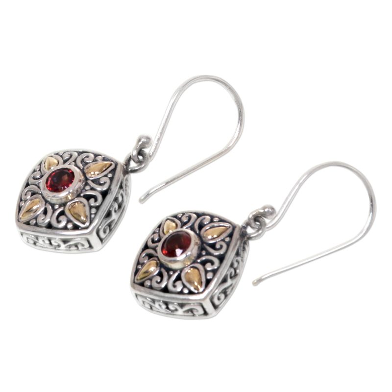 Sweet crimson gems sparkle from within florid settings in these dangle earrings from Bali's Kadek Wijanegara. The artisan crafts the earrings from sterling silver with accents of 18k gold, and sets them with round garnet stones.