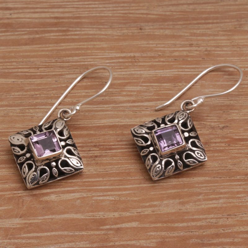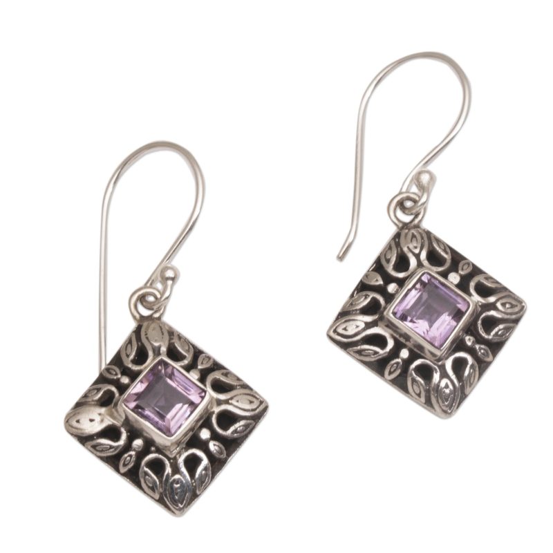 The intricately designed motif of this pair of 925 sterling silver earrings is like a window into the soul. The square setting of cast sterling silver with a vine-like motif holds something special within. The faceted purple amethyst gemstones, which total one carat, perfectly complement the sterling silver's polished and oxidized finishes for an eye-catching color combination to wear any day of the week.