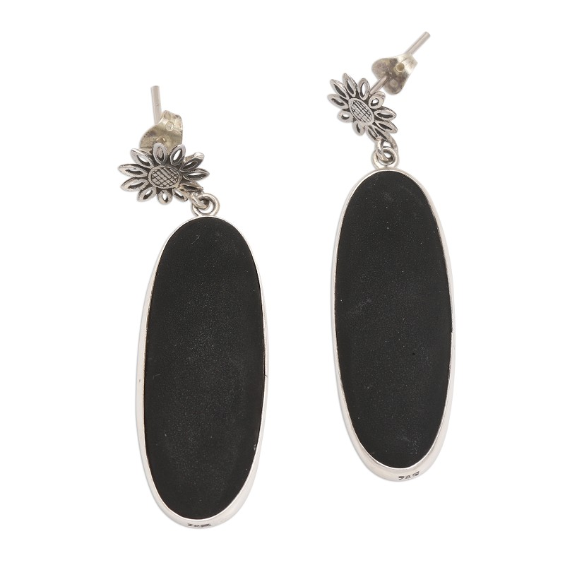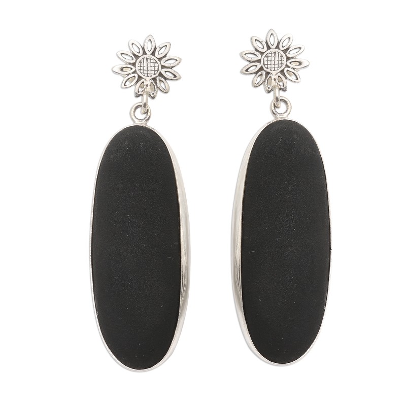 Narrow ovals of matte black lava stone dangle from delicate flower studs in these striking earrings from Bali's Rupadana. The stones are bezel-set in high-polish sterling silver, while the flowers feature a combination of high polish and oxidized finishes. Lava stone, also known as basalt, is one of the oldest stones on Earth and is believed to have protective powers.