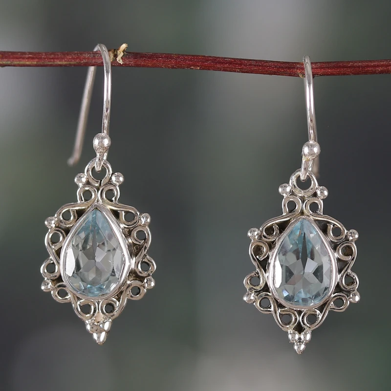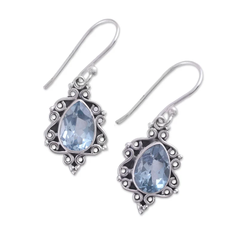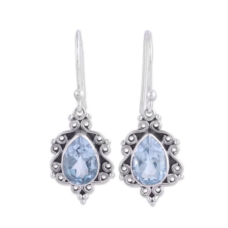 Sterling silver scrollwork forms a captivating frame for two twinkling blue topaz gems in these earrings. From Neeru Goel, the four carats are faceted for sparkle and the dangles hang from polished sterling hooks.