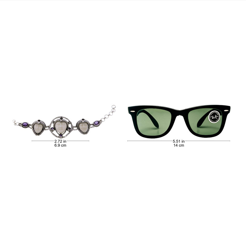 Hand-carved of cow bone with sublime finesse, three faces with closed eyes inspire serenity. Buana creates elaborate sterling silver headdresses for each one as he crafts the bracelet by hand. The bracelet sparkles with a total of 6.8 carats of faceted amethysts and blue topaz.