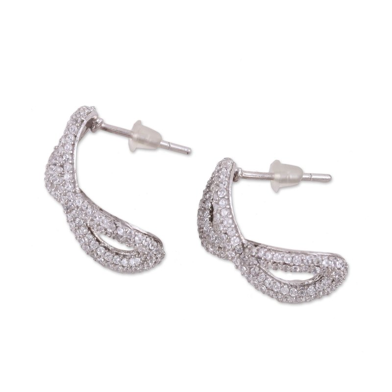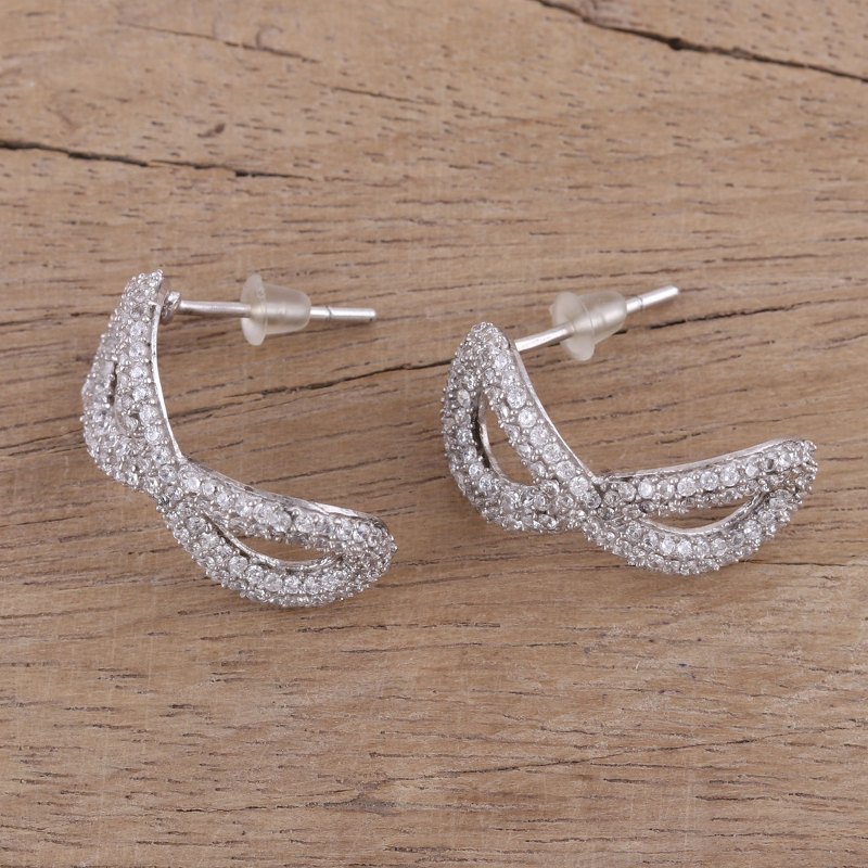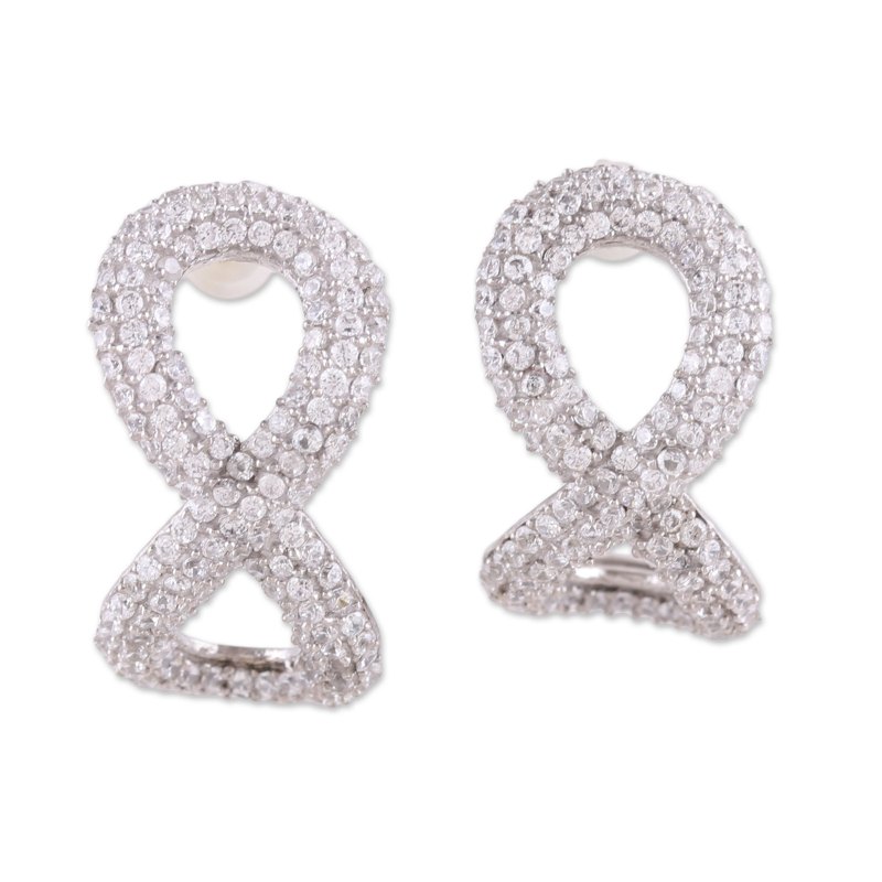 Indian artisan Sehal Agarwal creates a gorgeous pair of button earrings for the modern lady. Handcrafted from sterling silver, each earring features a wonderful infinity motif that is adorned with over a hundred sparkling faceted cubic zirconia. A high polish finish accentuates the glamorous allure of the design.