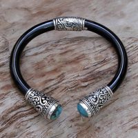 Balinese floral motifs in sterling silver adorn a beautiful bracelet from Wayan Asmana. Crafted by hand for dramatic contrasts, the black rubber cuff culminates in natural turquoise.