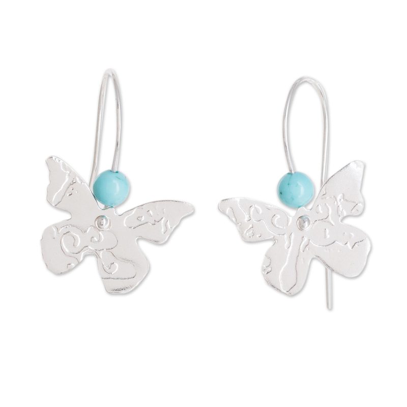 Crafted from sterling silver with a textured surface, two butterflies possess a glistening beauty. Costa Rica's Guisselle Mora creates the drop earrings, which are completed with small beads of reconstituted turquoise in sky blue hues.