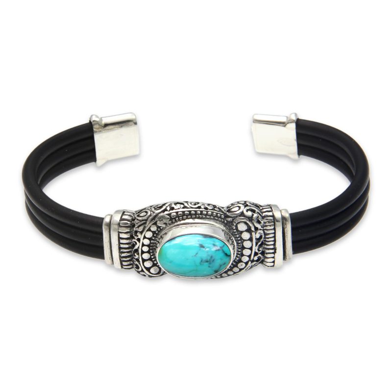 Wayan Asmana designs a trendy cuff that is rich in classic Balinese styling. Crafted by hand of black rubber, the bracelet is finely detailed in sterling silver and centered by reconstituted turquoise.