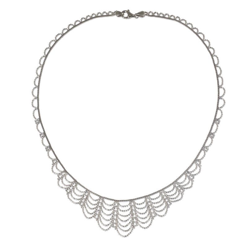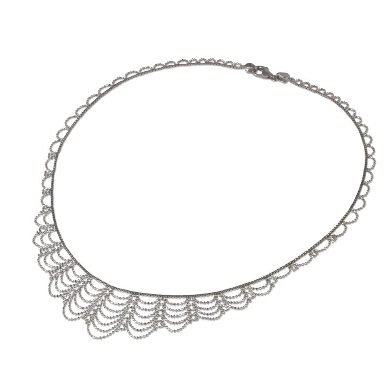 By Angels, this lacy necklace is crafted by hand. The young Thai artisan works with ball chains, effectively transforming them into original handcrafted jewelry. Graceful scallops cascade in a wide pendant of elegance and distinction.