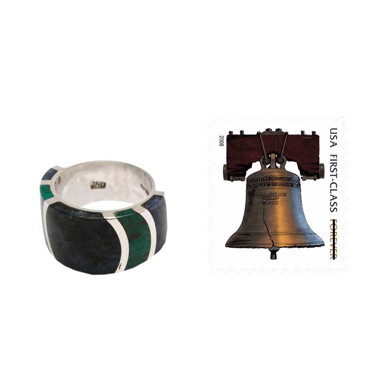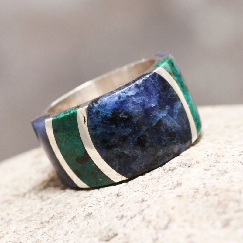 The inspired design of this ring evidences Adriana de Gadea's flair for originality. Sodalite and chrysocolla share their natural beauty as they cover 3/4 of a sterling silver band ring. The combination of colors is fantastic.