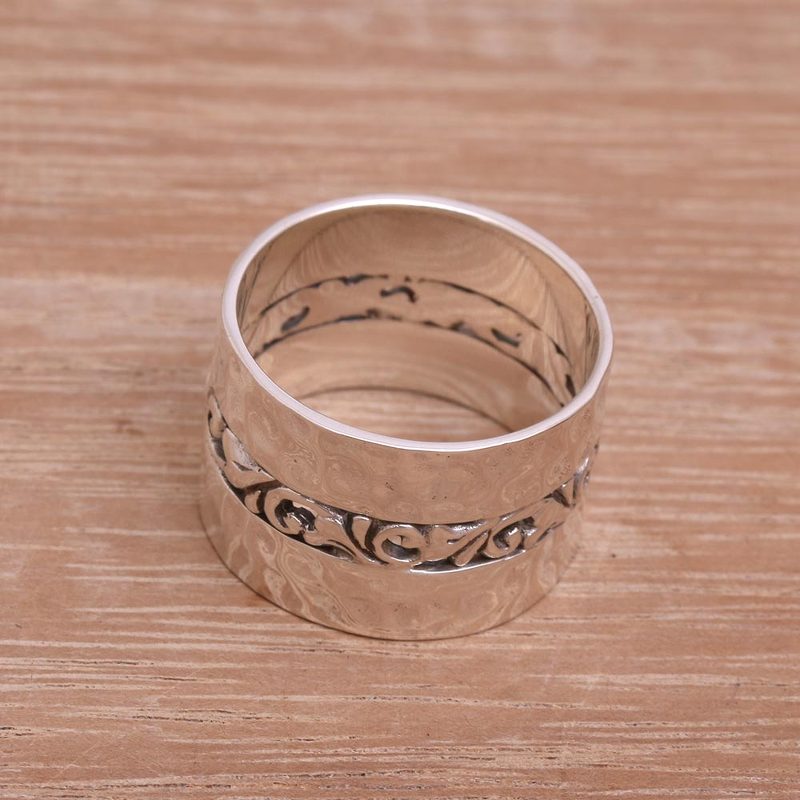 Openwork vines center this band ring from Indonesia, surrounded by elegant hammered textures on either side. Indonesian artisan Suar Dwipayana crafts this majestic ring of sterling silver, sure to draw attention wherever it goes.