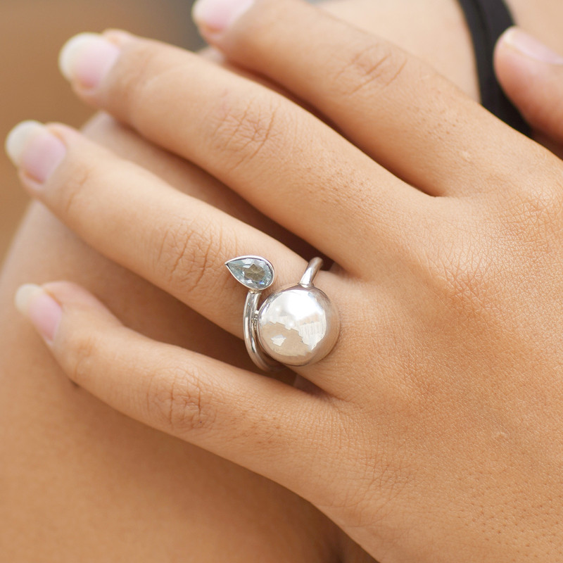 This ring is so cool. Unexpected pairing of the pretty blue tear and the sphere of sterling. Shiny, abstract, modern.