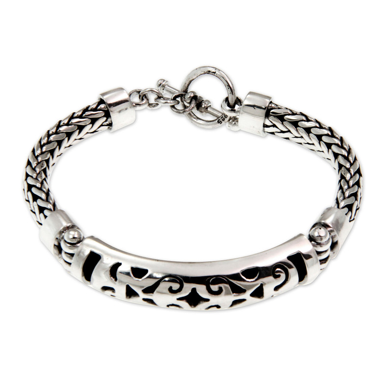 Centering sterling braids, a silver amulet whispers a blessing. From Wayan Asmana, this bracelet speaks in symbols, conjuring a universal symbol of peace. It is a superb example of modern Balinese design.