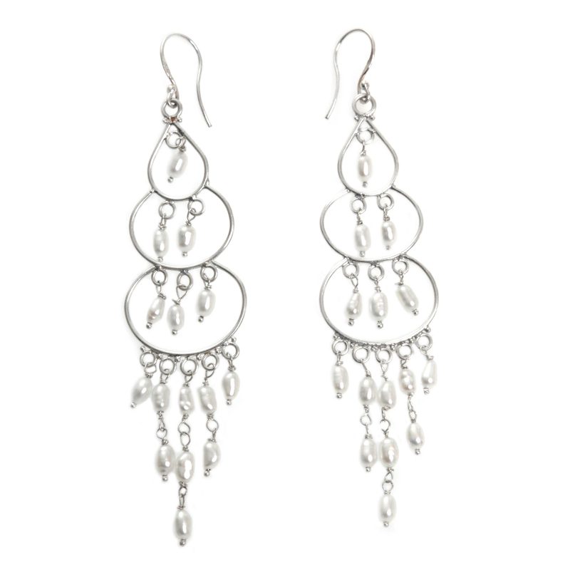 This pair of chandelier earrings is designed by Indonesia's Made Sugi. Featuring a handcrafted design from sterling silver, the earrings are composed of cultured freshwater pearls that hang from graduated circular shapes.