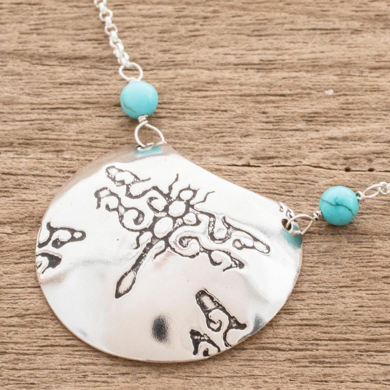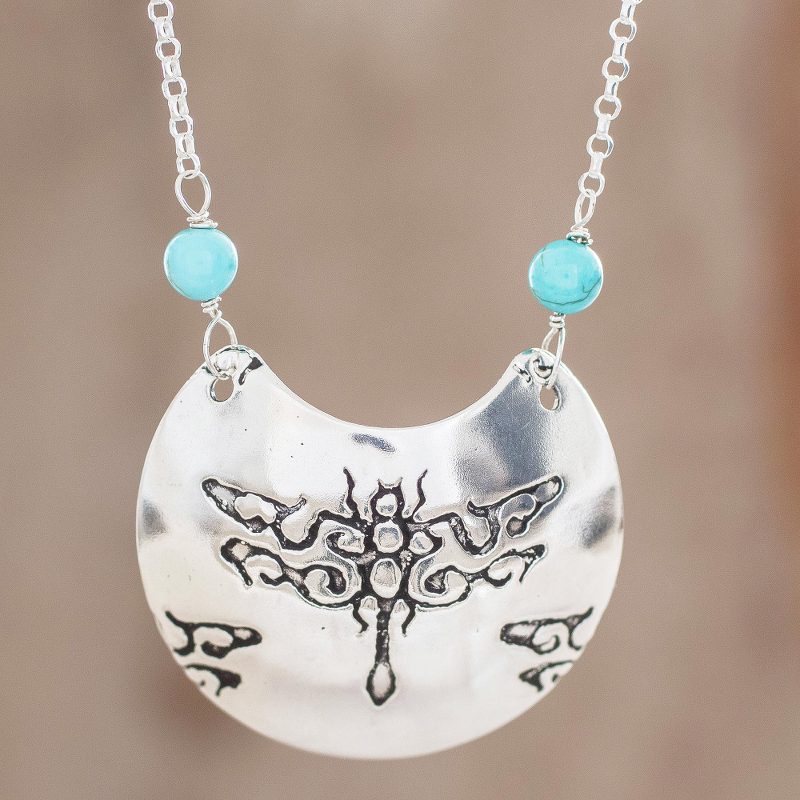Crafted of sterling silver, a stunning crescent is elaborated with dragonfly imprints, centering this pendant necklace from Costa Rica. Drawing inspiration from the fauna of her country, Guisselle Mora creates the necklace, flanking the pendant with two beads of reconstituted turquoise.