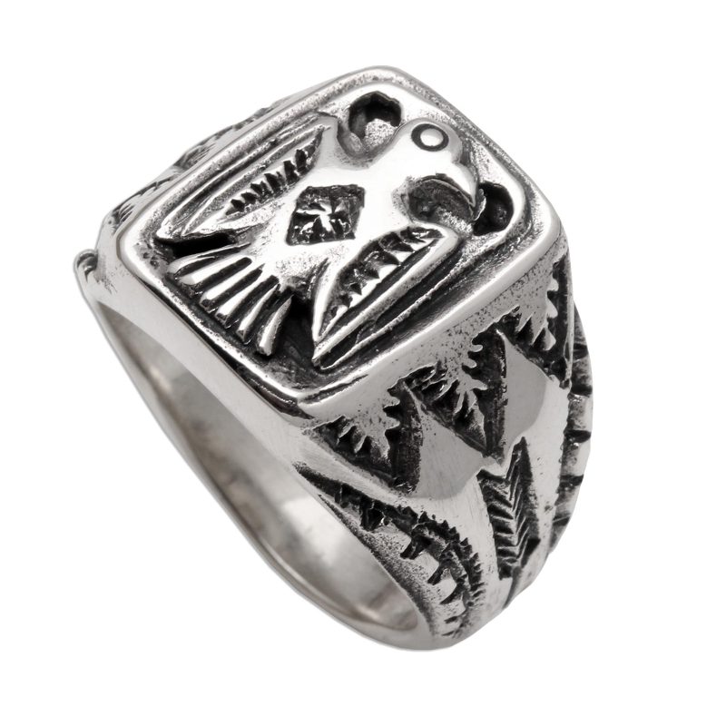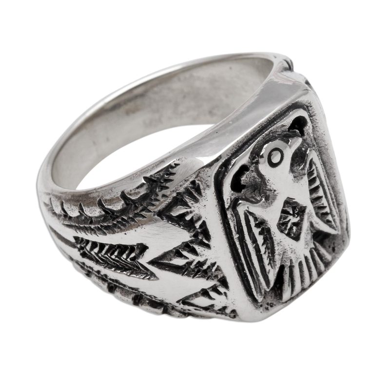 In majestic relief, an ancient eagle decorates the square front of this signet ring from Bali. Nyoman Rena creates this ring, which is crafted from sterling silver and treated with a combination of finishes. Tree patterns decorate the sides of the band.