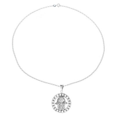 This sterling silver pendant necklace features the symbol of Hamsa, a decorated open palm believed to be protection from the evil eye. Bhavya Jain designs this handcrafted pendant with the Hamsa symbol encircled by a ring of swirls.