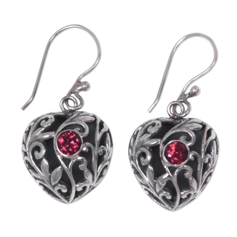 Garnets sparkle with the light of passion in sterling silver hearts. Crafted by hand, these earrings from Putu Putri are covered with graceful forest vines.