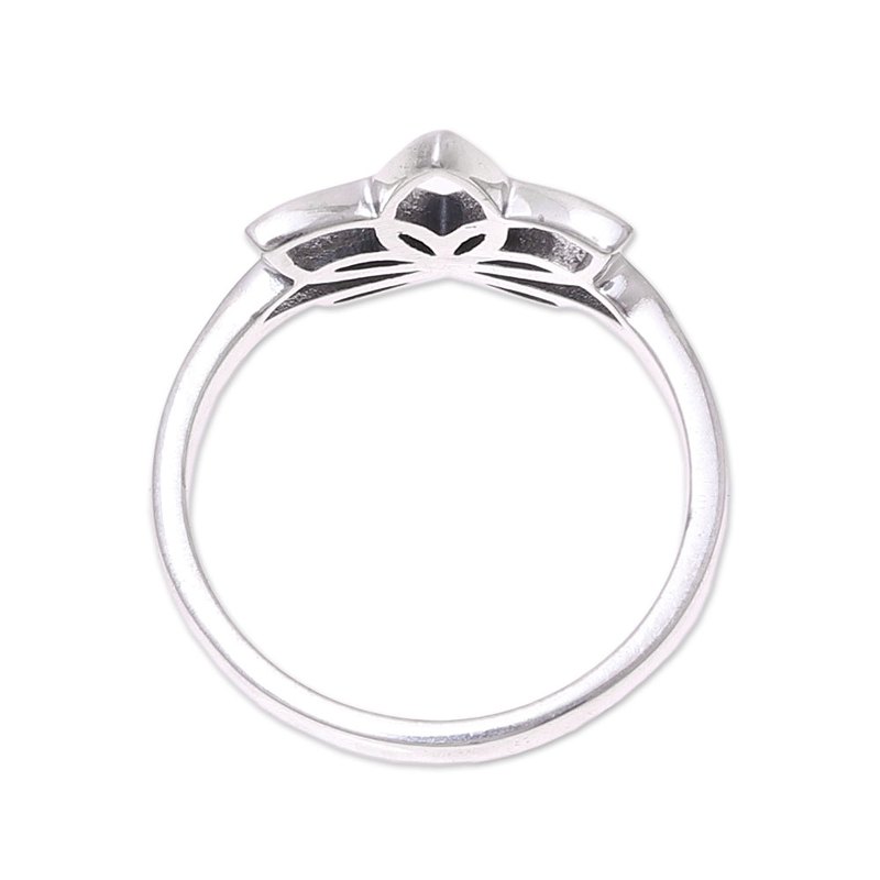 This simply elegant sterling silver cocktail ring features an openwork lotus flower in the center of the band. Bhavya Jain designs this ring that celebrates the purity of body and spirit symbolized by the lotus flower.